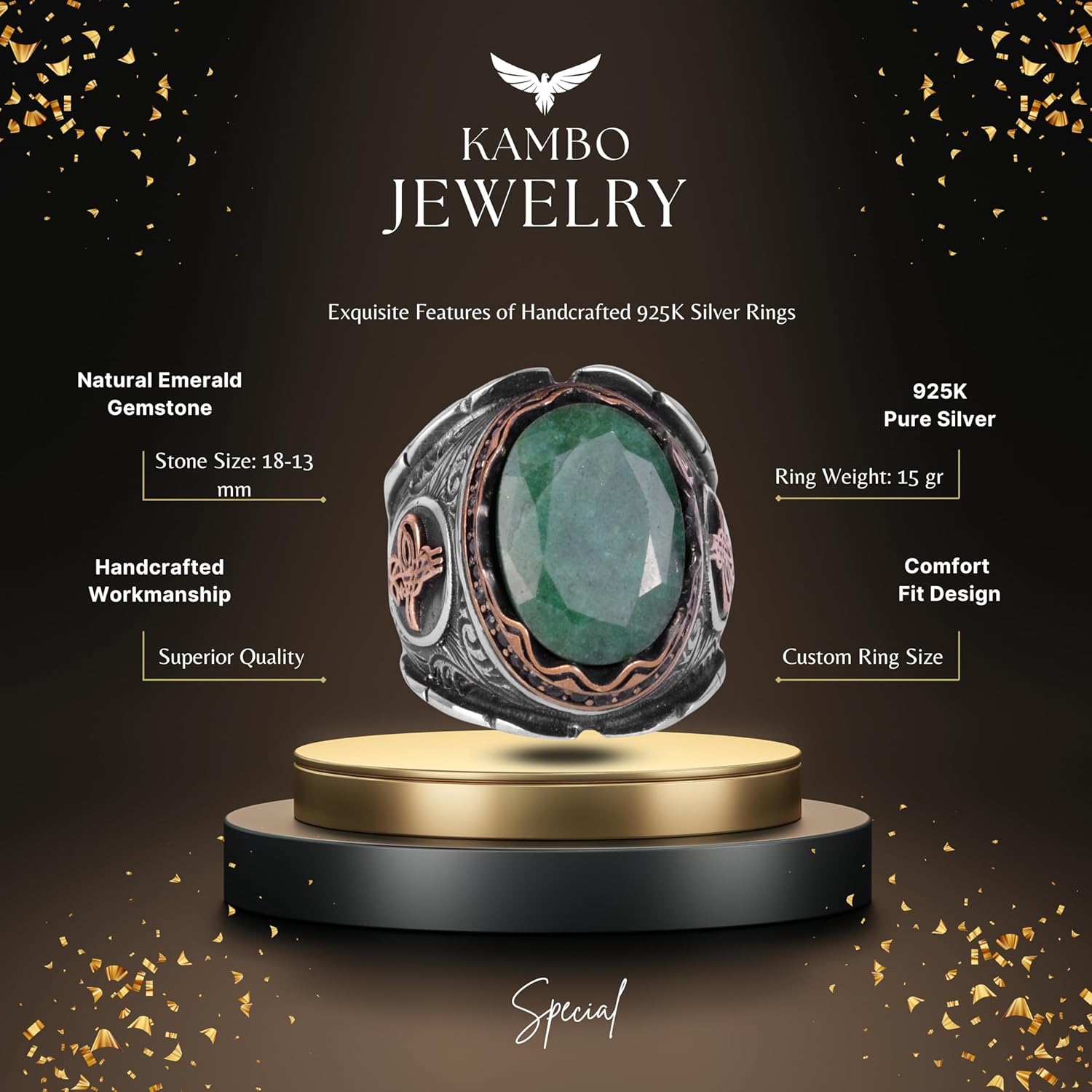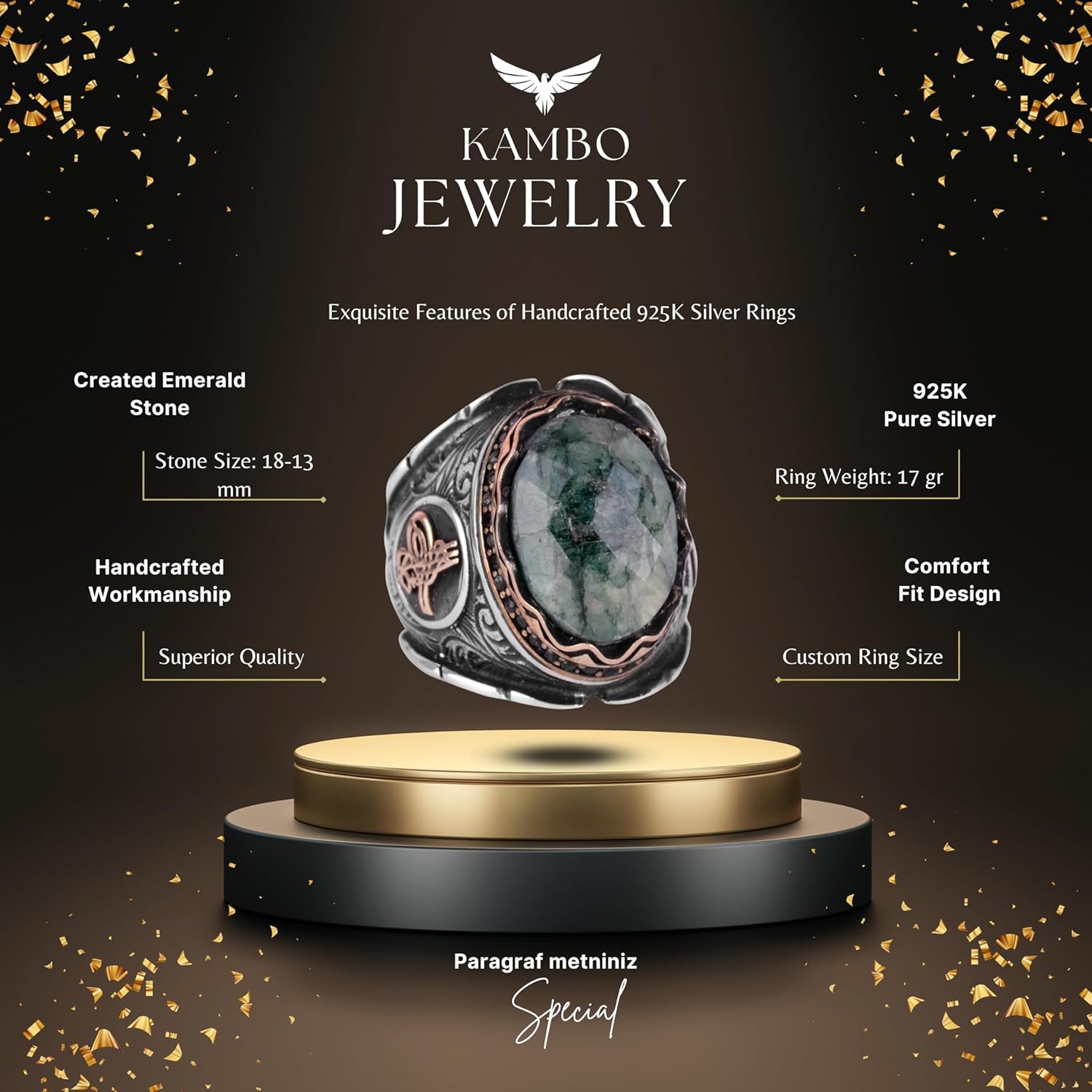 Osmanlı Tuğra Gümüş Yüzük, Doğal Taş Yüzük, 925 Ayar Gümüş Yüzük (Zümrüt)