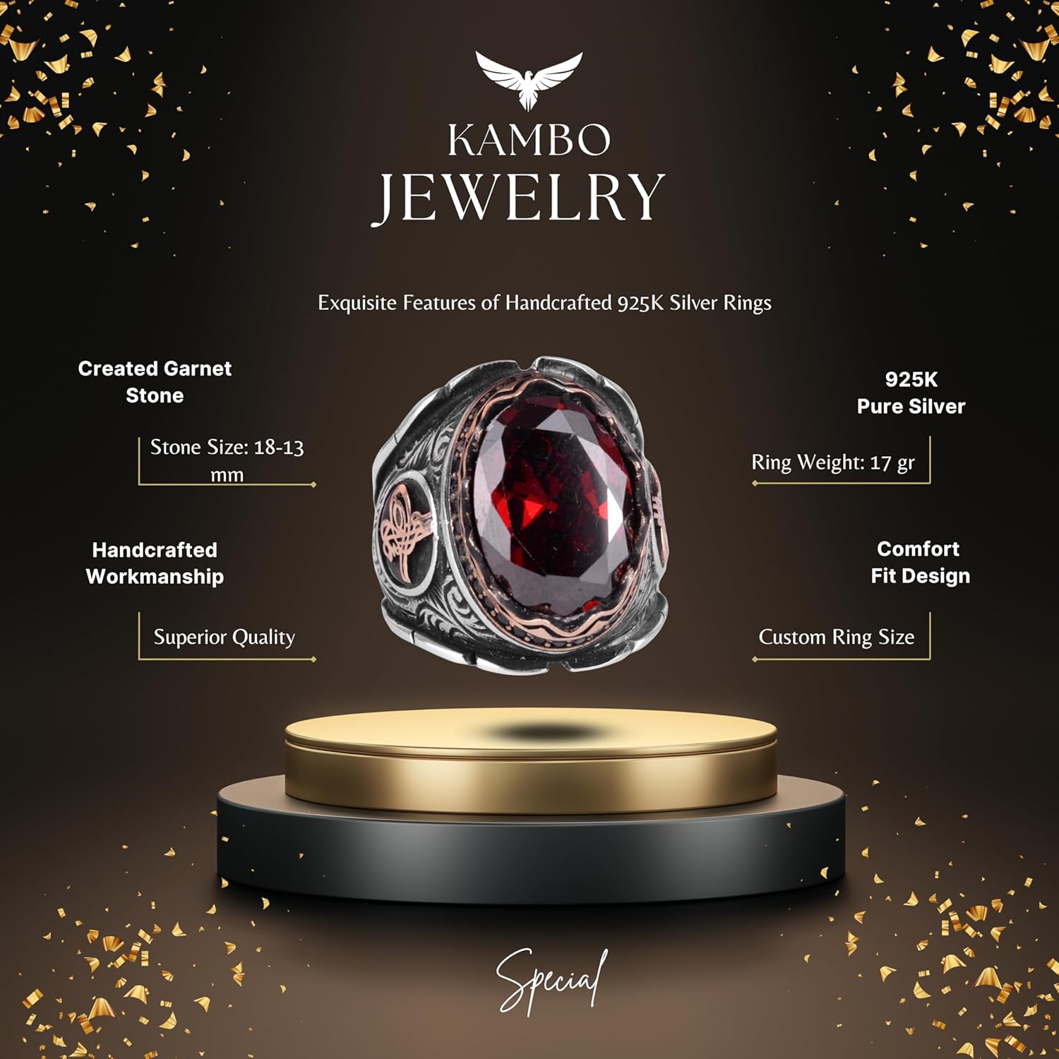 Osmanlı Tuğra Gümüş Yüzük, Oluşturulmuş Granat Taşlı Yüzük, 925 Ayar Gümüş Yüzük