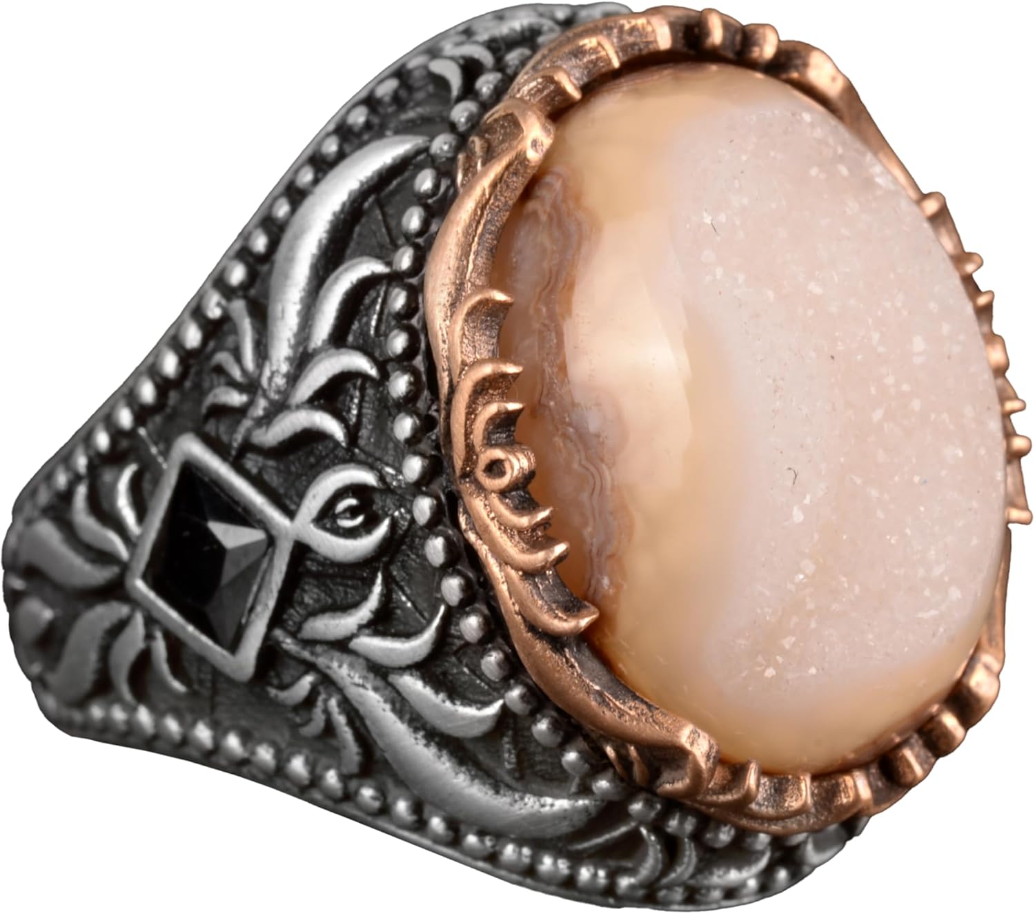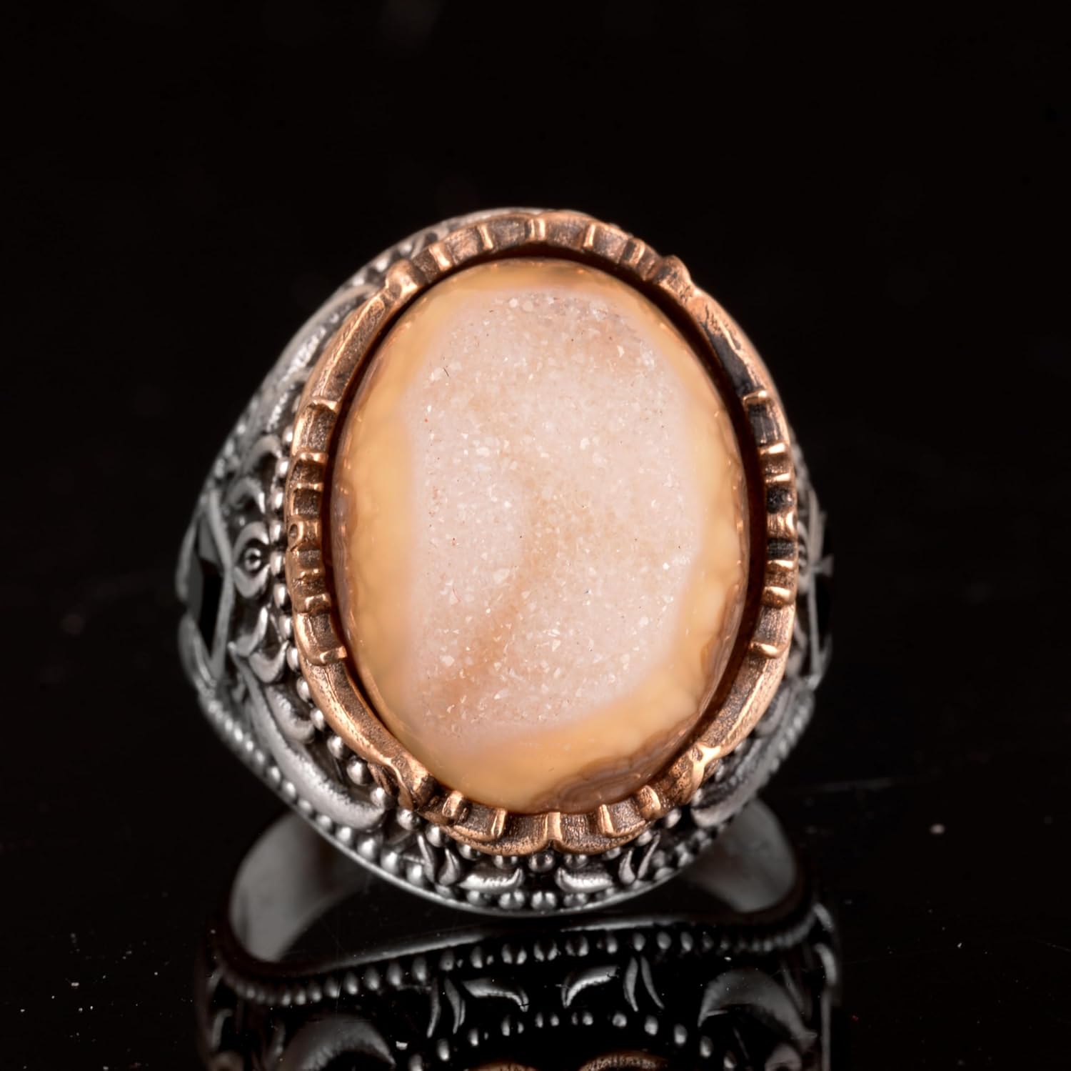 Vintage Erkek 925 Ayar Gümüş Yüzük Druzy Kuvars: Yeşil, Kırmızı, Lacivert, Bej, Siyah (Bej)