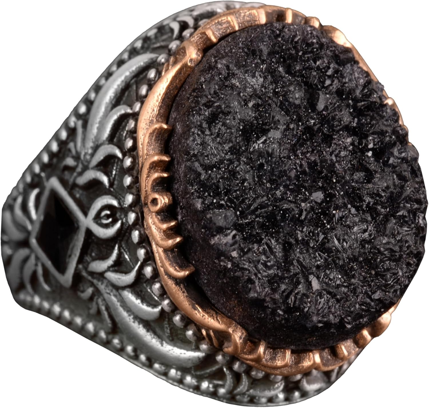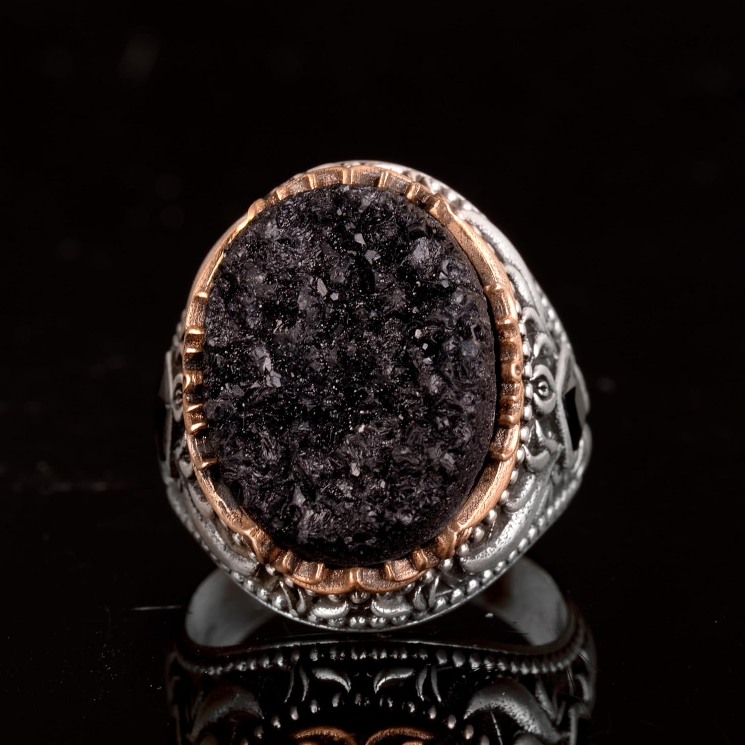 Vintage Erkek 925 Ayar Gümüş Yüzük Druzy Kuvars: Yeşil, Kırmızı, Lacivert, Bej, Siyah (Siyah)