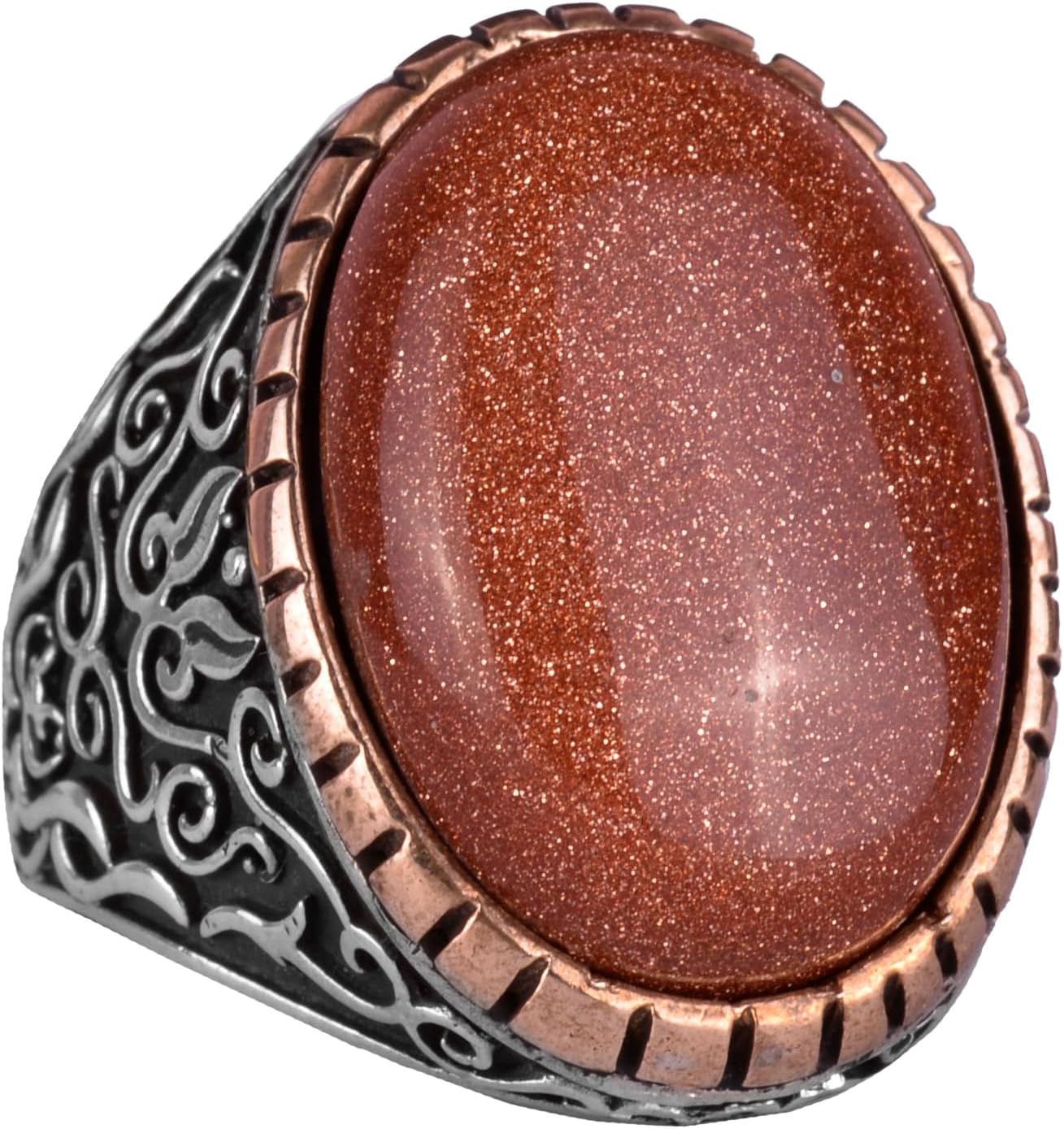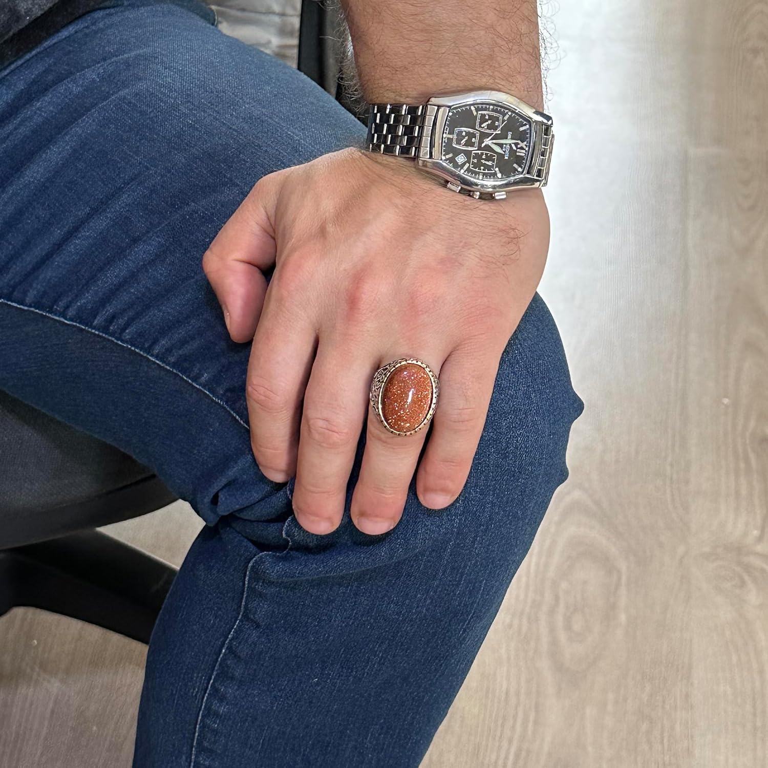 Yapay Taş Yüzük, 925 Ayar Gümüş Erkek Yüzüğü, Büyük Yüzük (Kahverengi Güneş Taşı Yapay Taş)