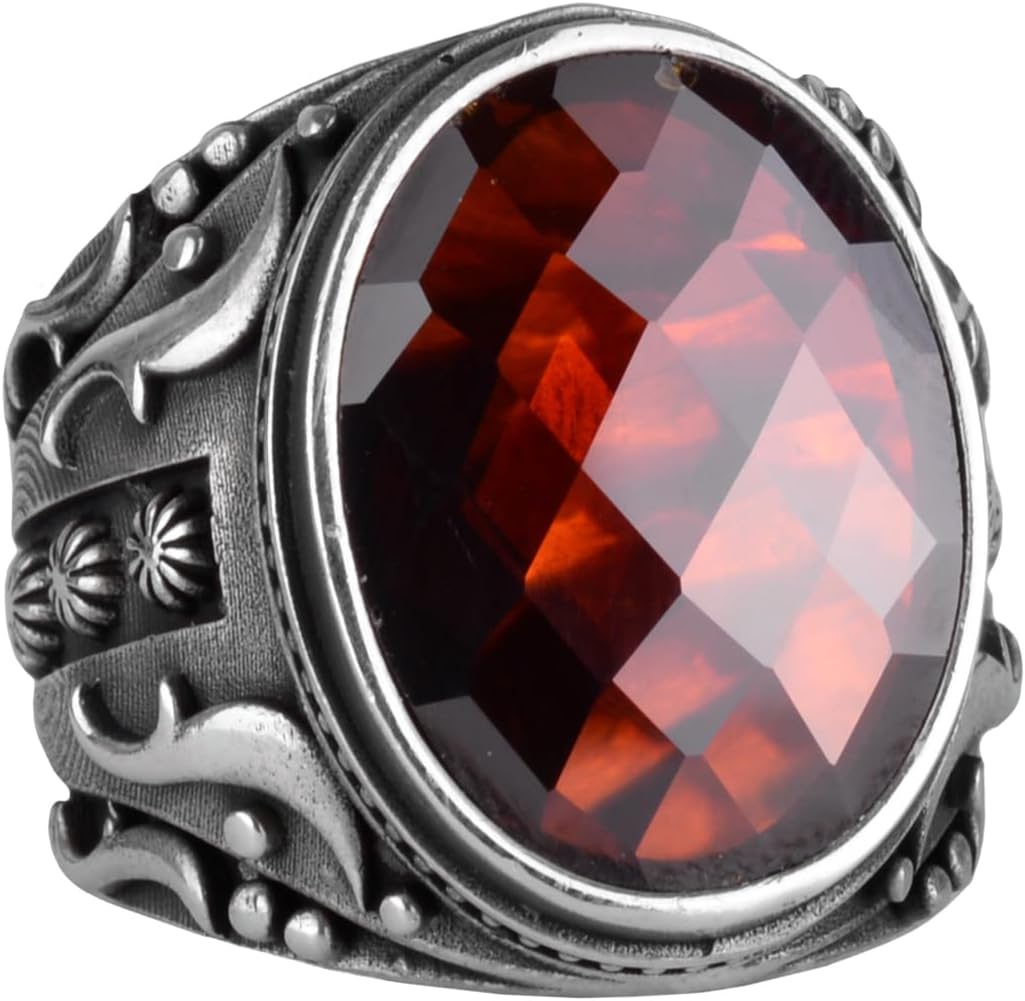 Yapılmış Taş Yüzük, 925 Ayar Gümüş Yüzük, Tasarım Gümüş Erkek Yüzüğü (Yapılmış Granat Taşı)