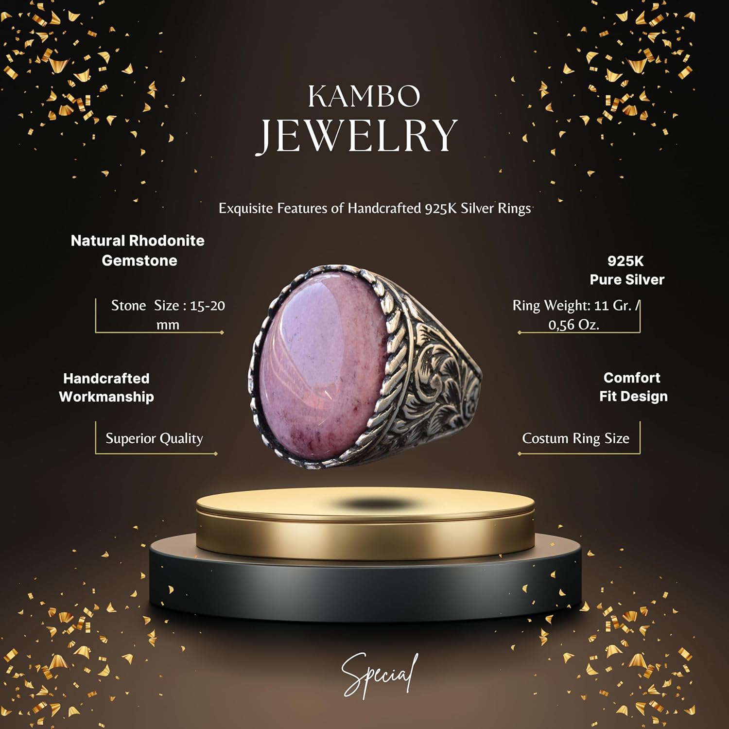 925 Ayar Gümüş Yüzük - Gerçek Doğal Taş Yüzük - Rhodonit