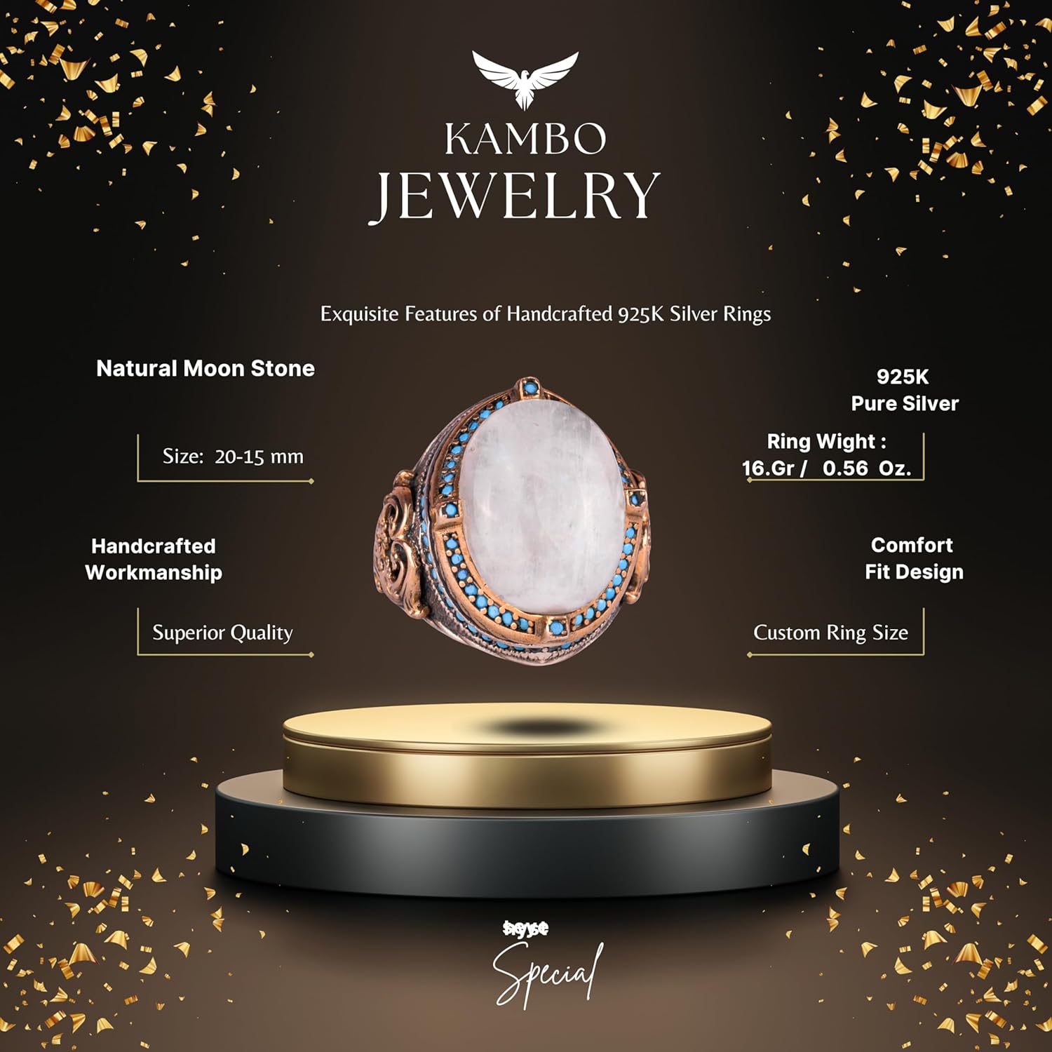 925 Ayar Gümüş Yüzük ile Doğal Ay Taşı, El Yapımı Erkek Yüzük, Vintage Tasarım