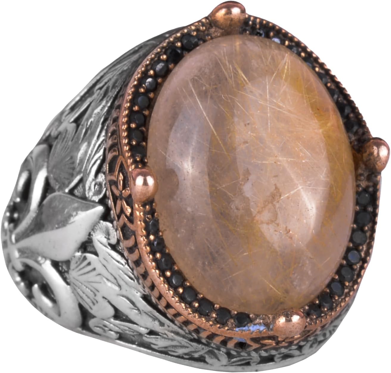 925 Ayar Gümüş El Yapımı Erkek Yüzük - Çeşitli Doğal Taşlarla Mevcuttur (Cabochon Altın Rutilatlı Kuvars)