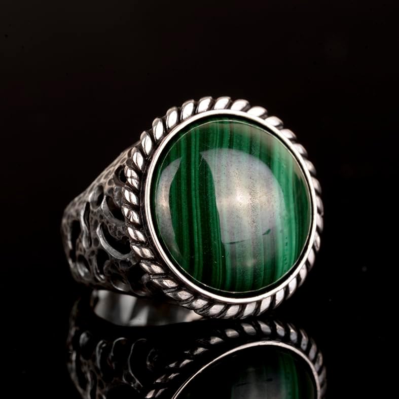 925 Ayar Gümüş Yüzük, Gerçek Doğal Malahit Taş Yüzük, Yuvarlak Erkek Yüzüğü