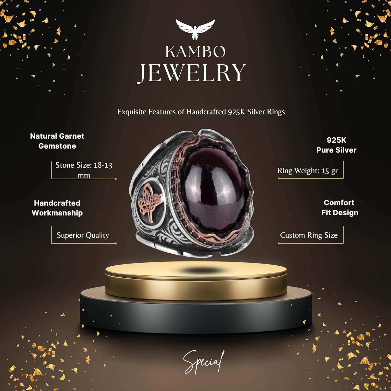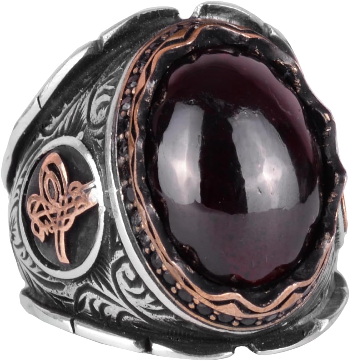 925 Ayar Gümüş Yüzük, Gerçek Doğal Garnet Taşlı Yüzük, Osmanlı Tuğra Yüzüğü