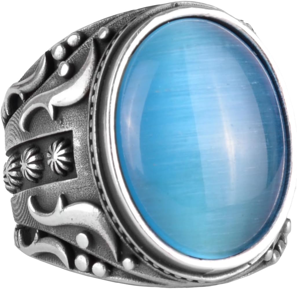 925 Ayar Gümüş Yüzük, Tasarım Gümüş Erkek Yüzüğü (Yapay Açık Mavi Kedi Gözü Taşı)