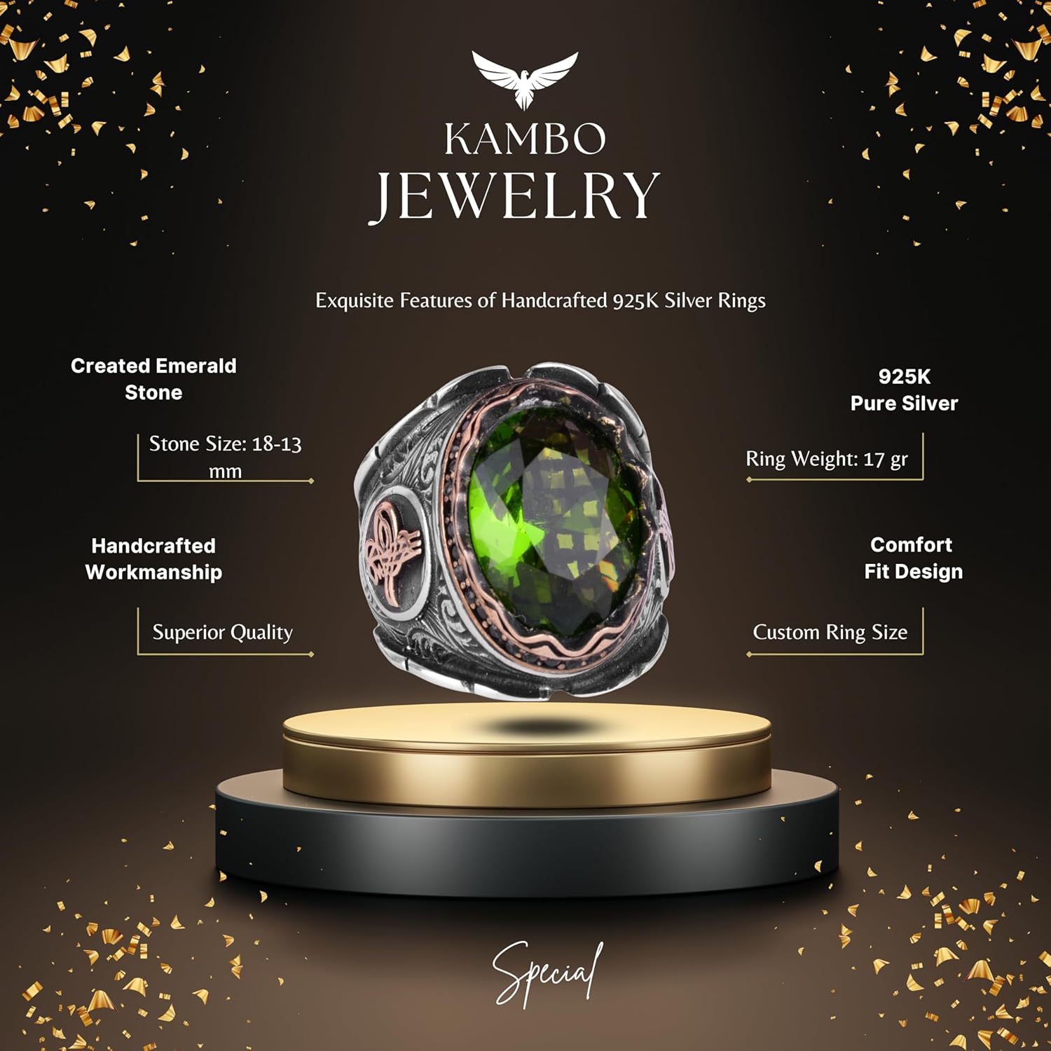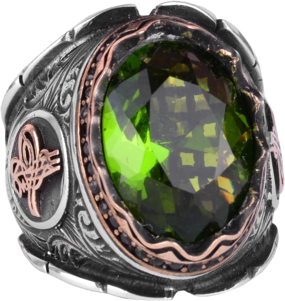 925 Ayar Gümüş Yüzük, Osmanlı Tugra Zümrüt Yapay Taşlı Yüzük