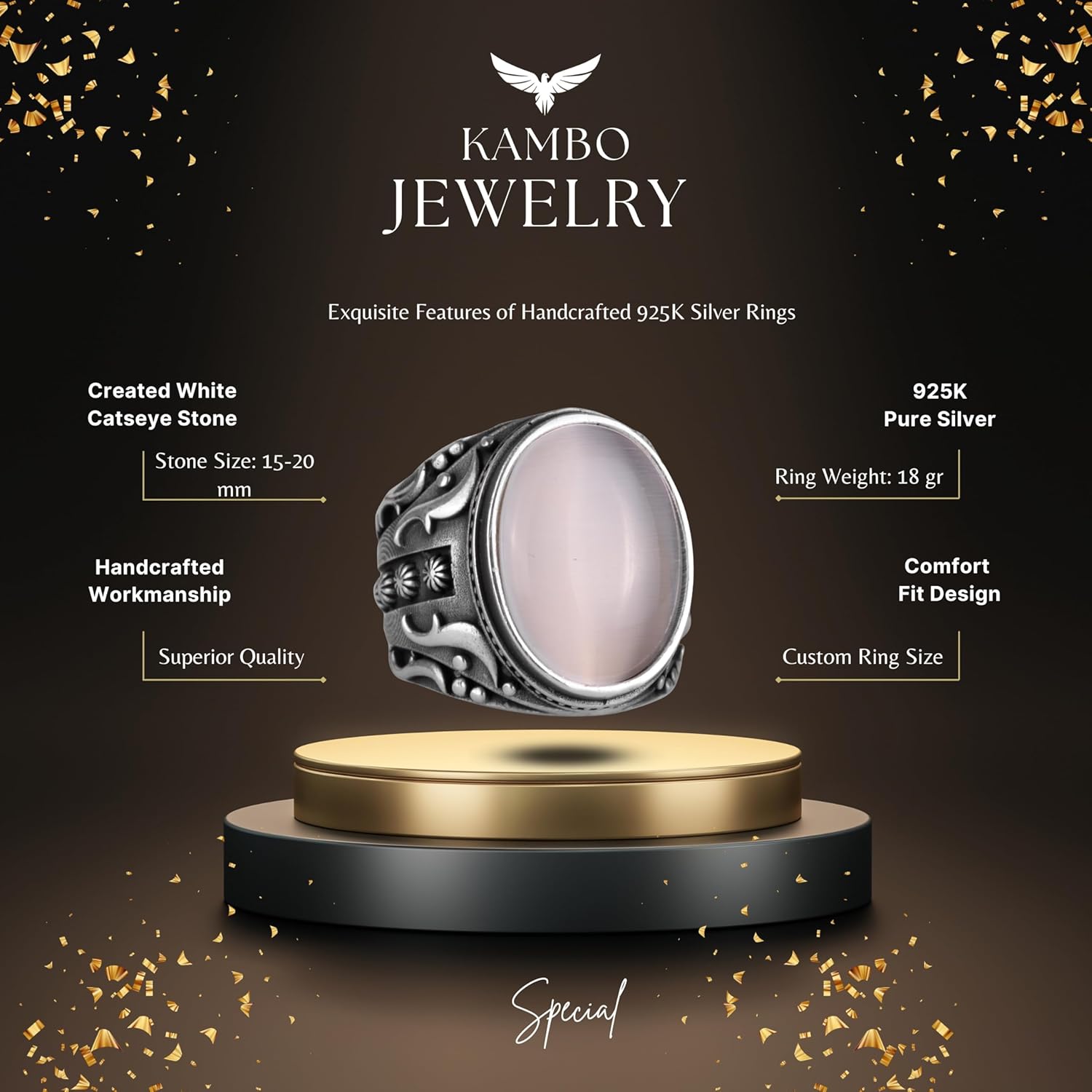 925 Ayar Gümüş Yüzük, Tasarım Gümüş Erkek Yüzüğü (Beyaz Kedi Gözlü Yapay Taş)