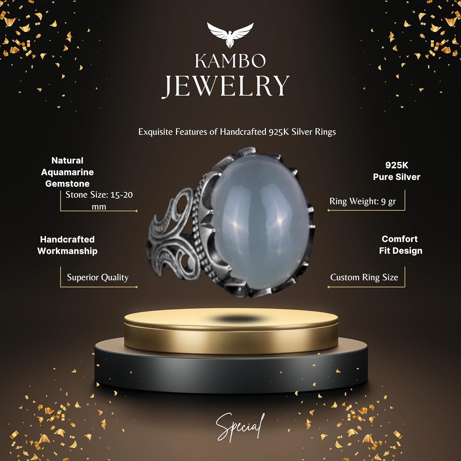 925 Ayar Katı Gümüş Erkek Yüzük - Doğal Taş Seçeneği ile El Yapımı Tasarım (Cabochon Akuamarin)