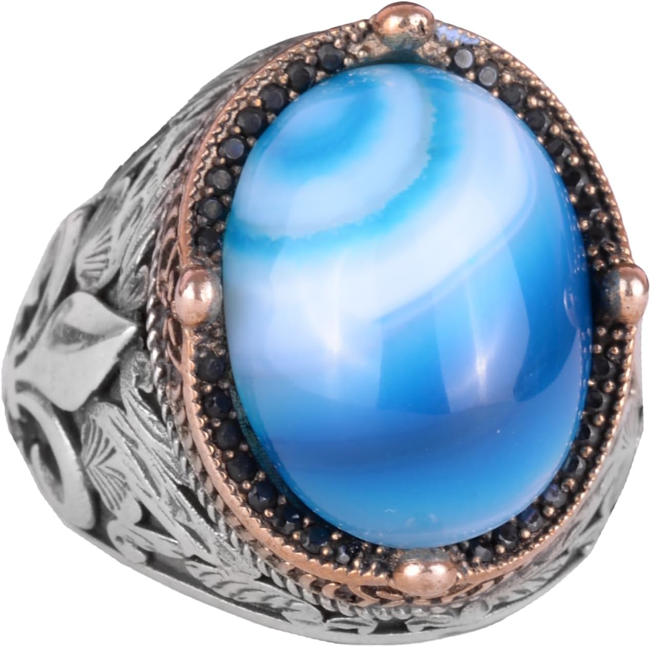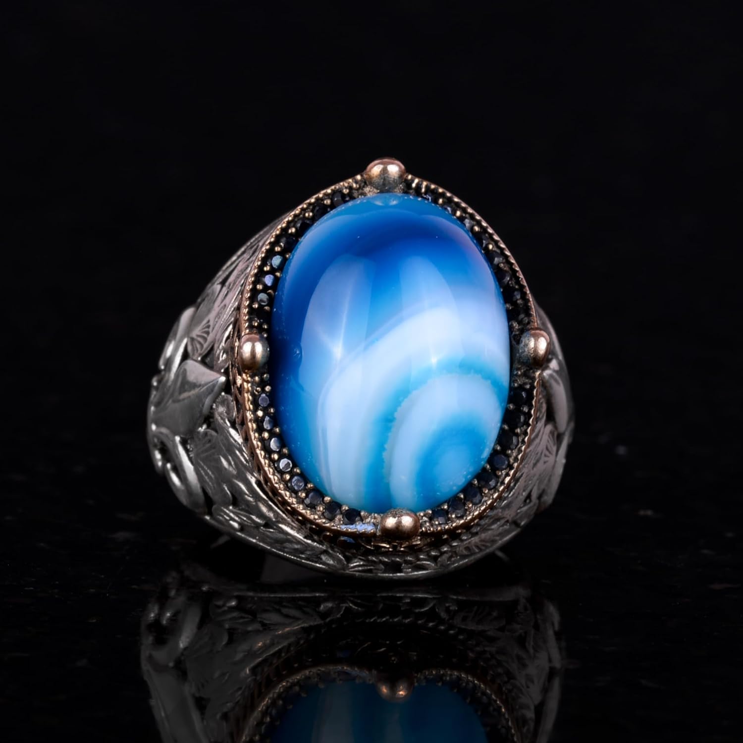 925 Ayar Gümüş El Yapımı Erkek Yüzük - Doğal Mavi Agate Taşlı