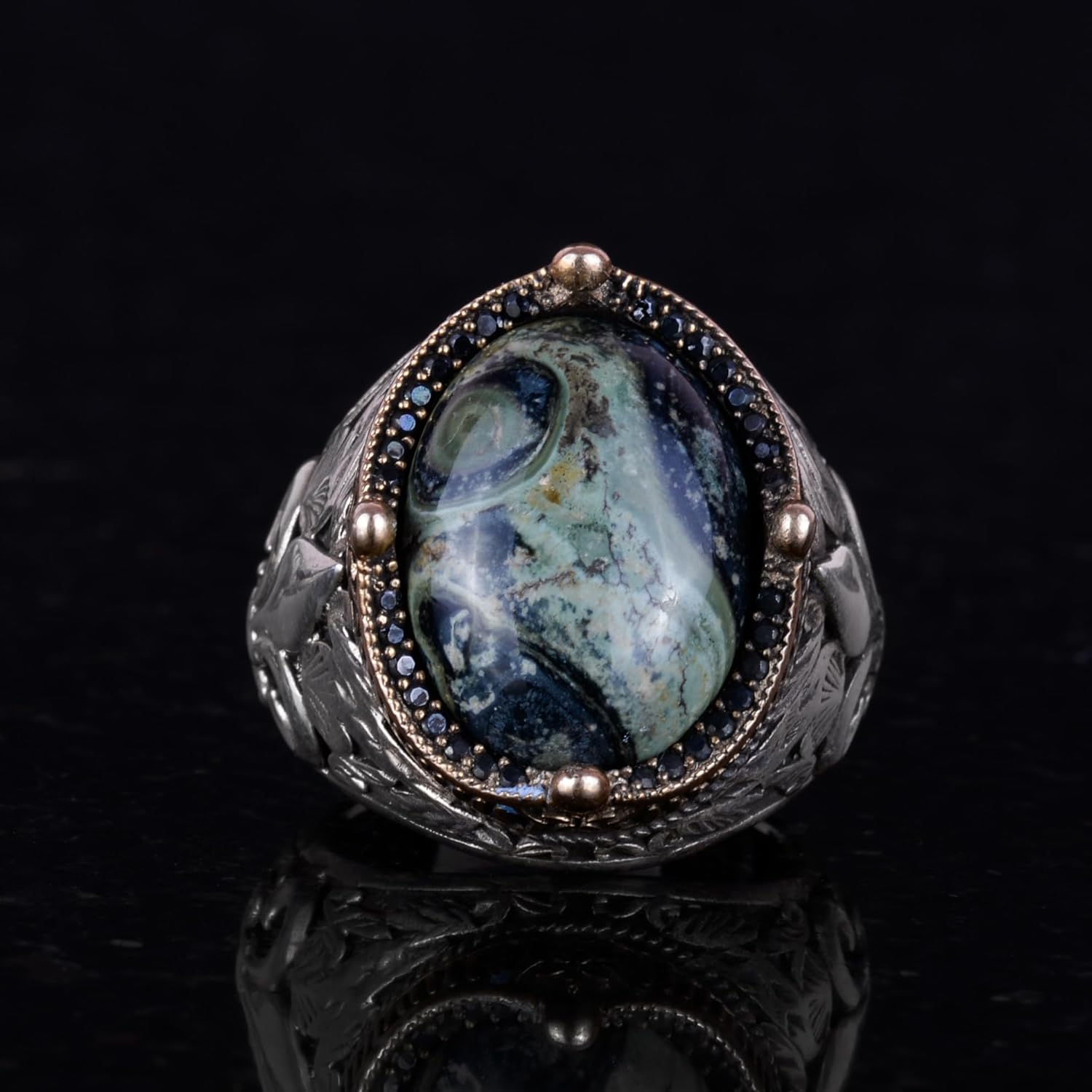 925 Ayar Gümüş El Yapımı Erkek Yüzük - Farklı Doğal Taşlarla Mevcuttur (Yeşil Göz)