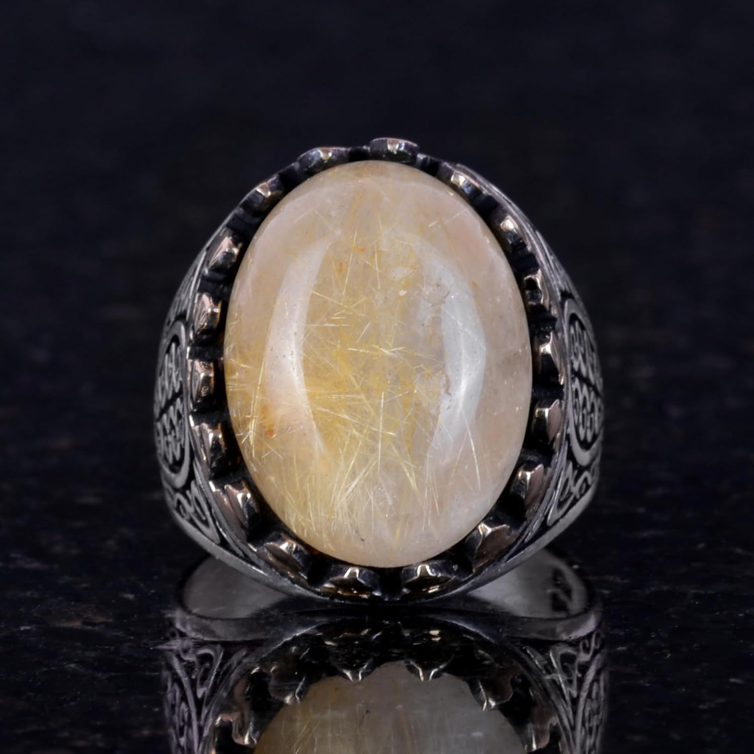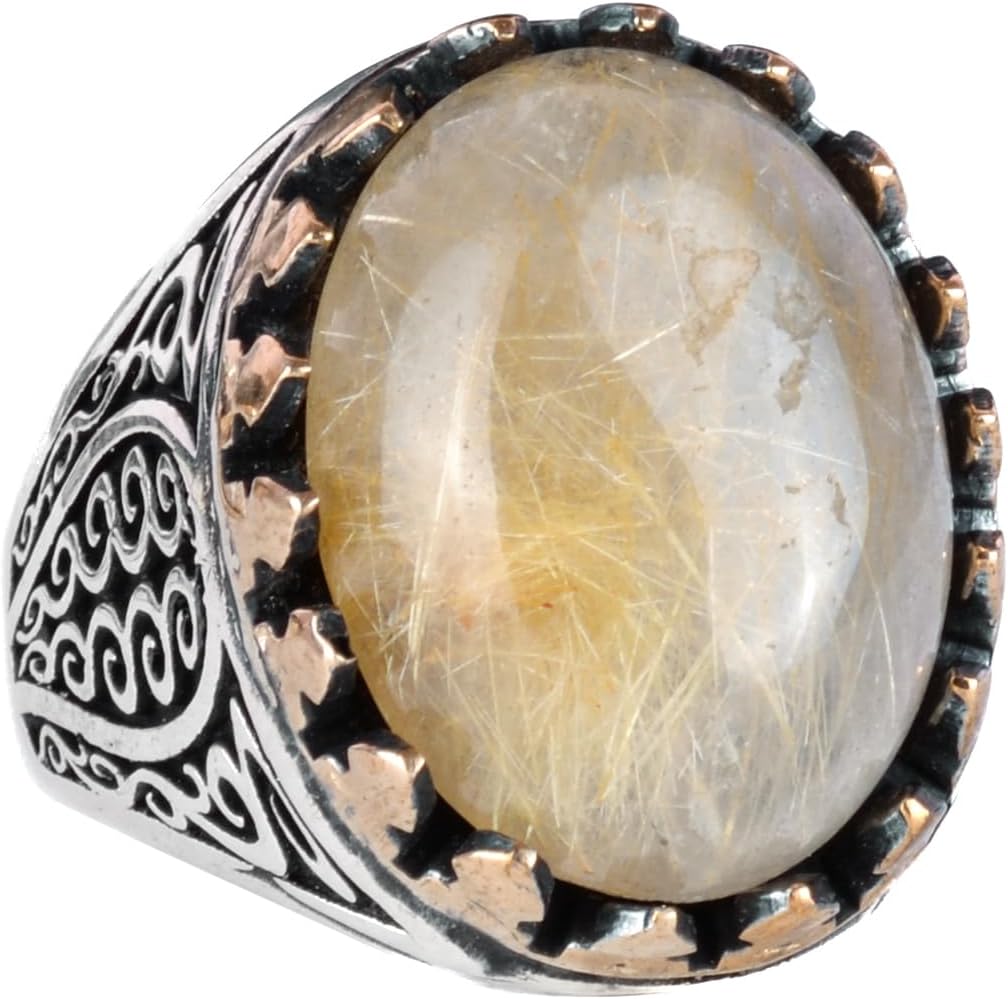 925 Ayar Katı Gümüş Erkek Yüzük - Doğal Taşlarla El Yapımı Zarafet (Altın Rutilatlı Kuvars Taşı)