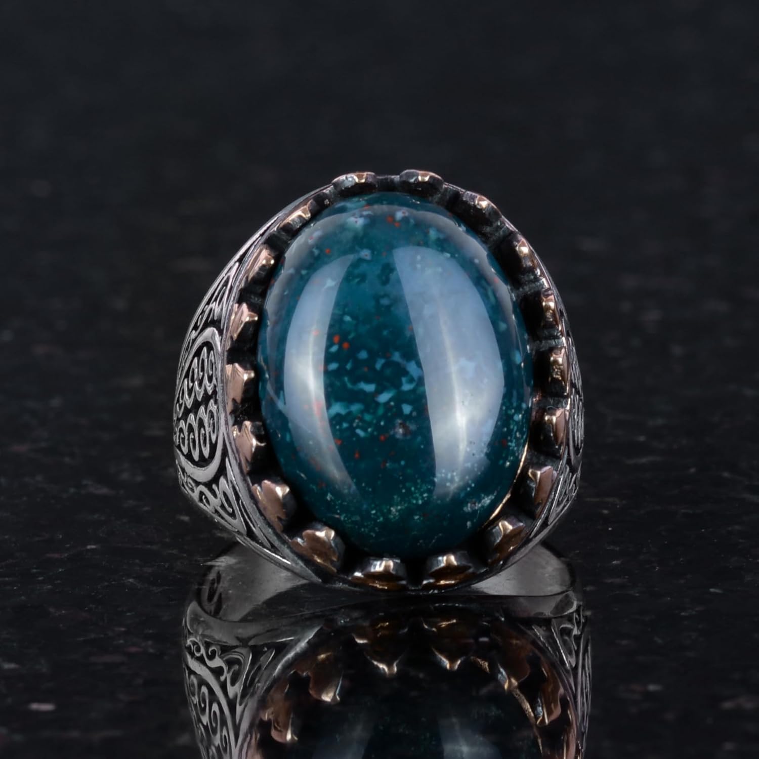 925 Ayar Katı Gümüş Erkek Yüzük - Doğal Taşlarla El Yapımı Zarafet (Yeşil Kan Taşı)
