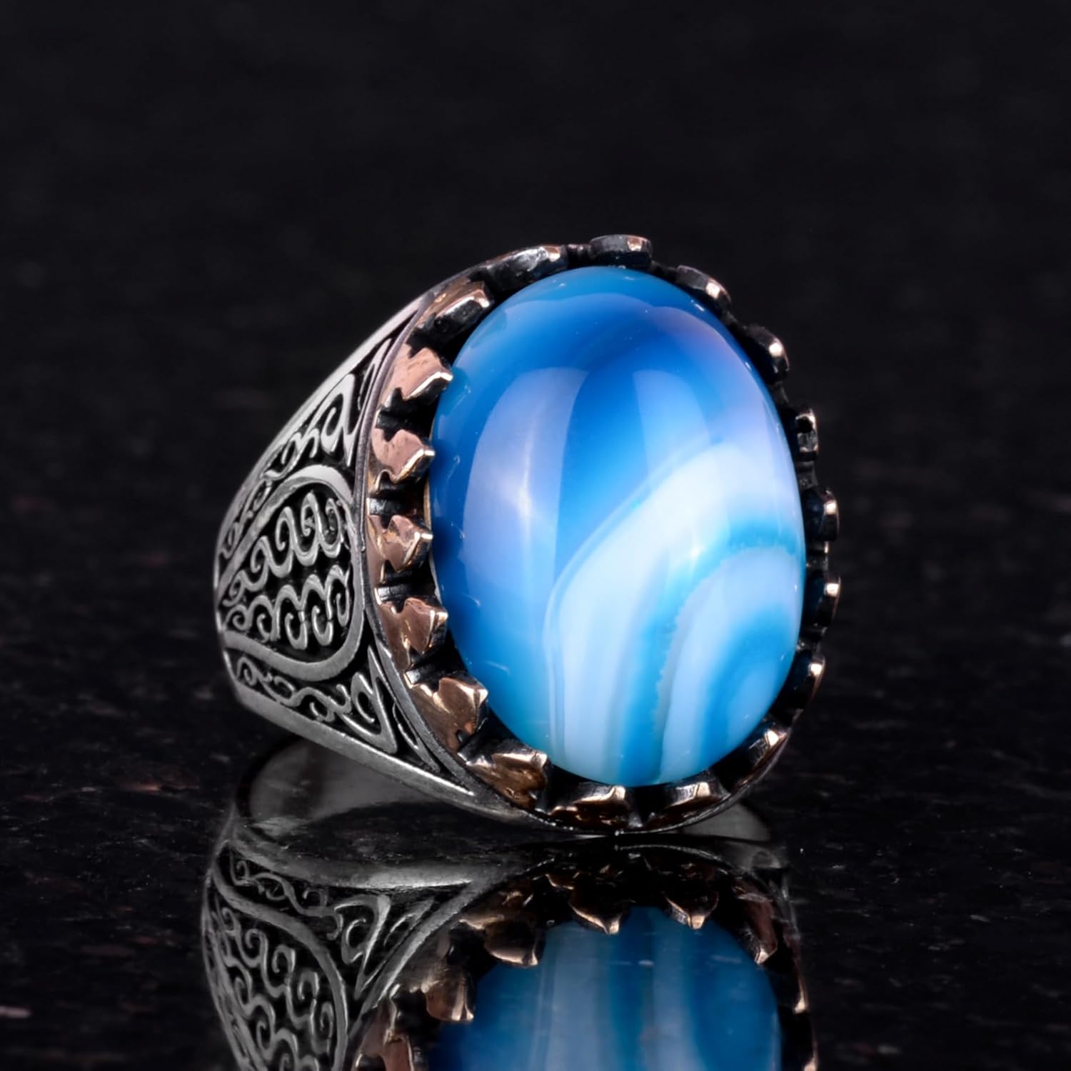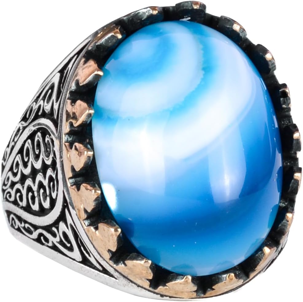 925 Ayar Saf Gümüş Erkek Yüzük - Doğal Taşlarla El Yapımı Şıklık (Mavi Akik Taşı)