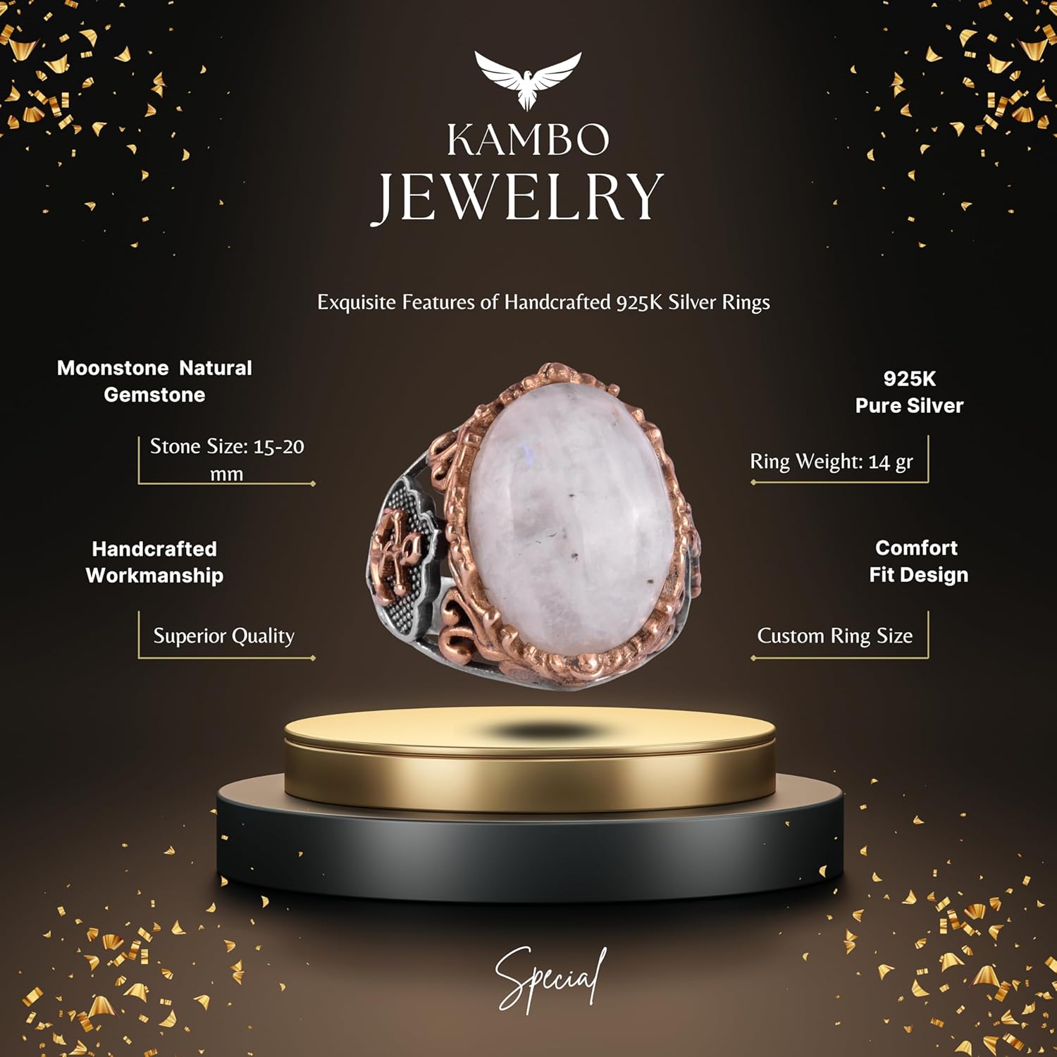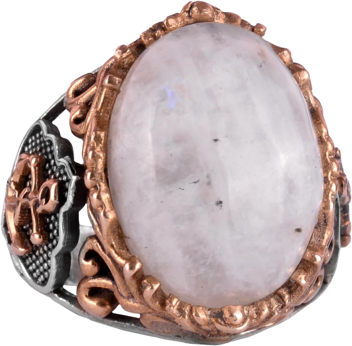 925 Ayar Saf Gümüş Erkek Yüzük, Doğal Ay Taşı Taşları - El Yapımı Tasarım, Denizci Çapa Yüzüğü