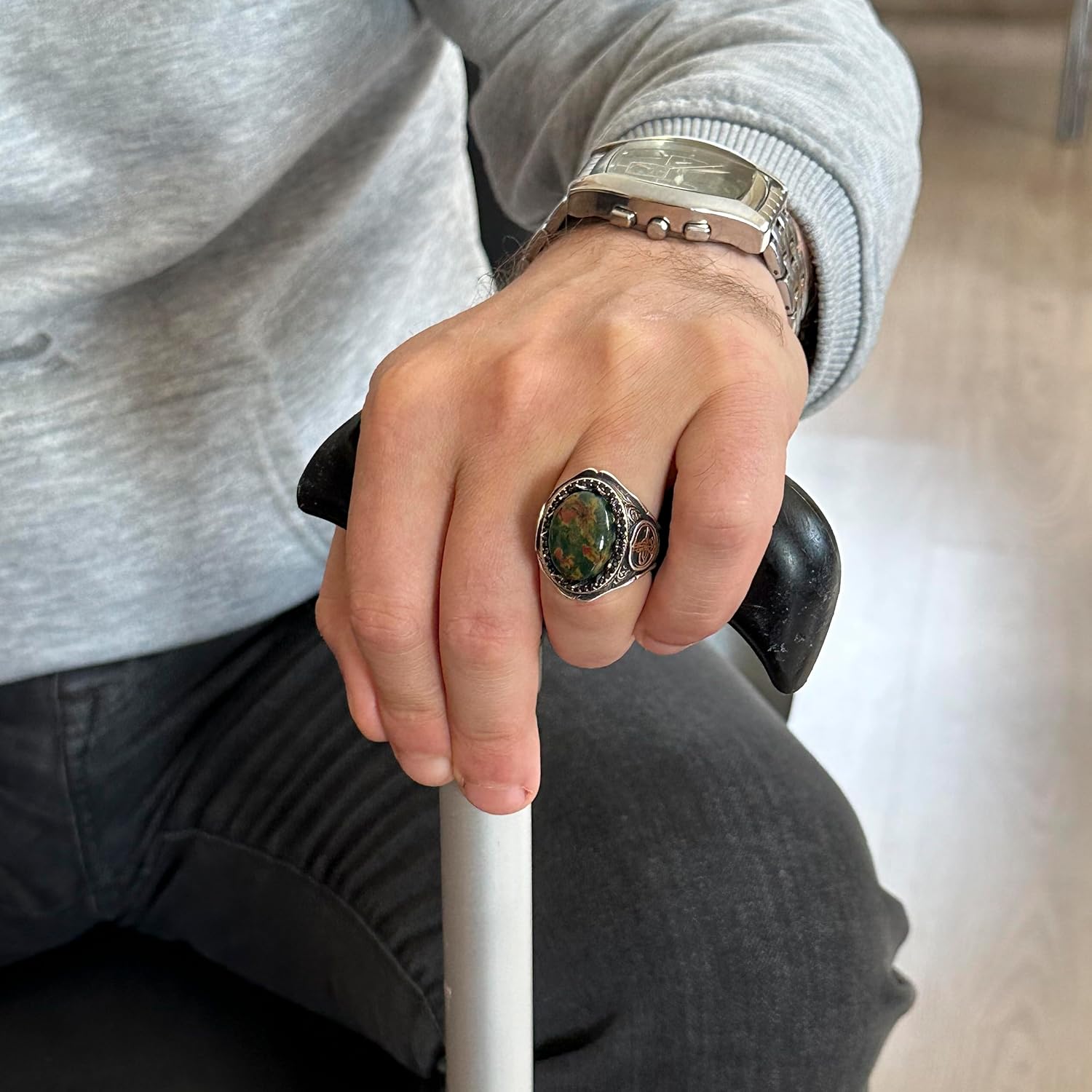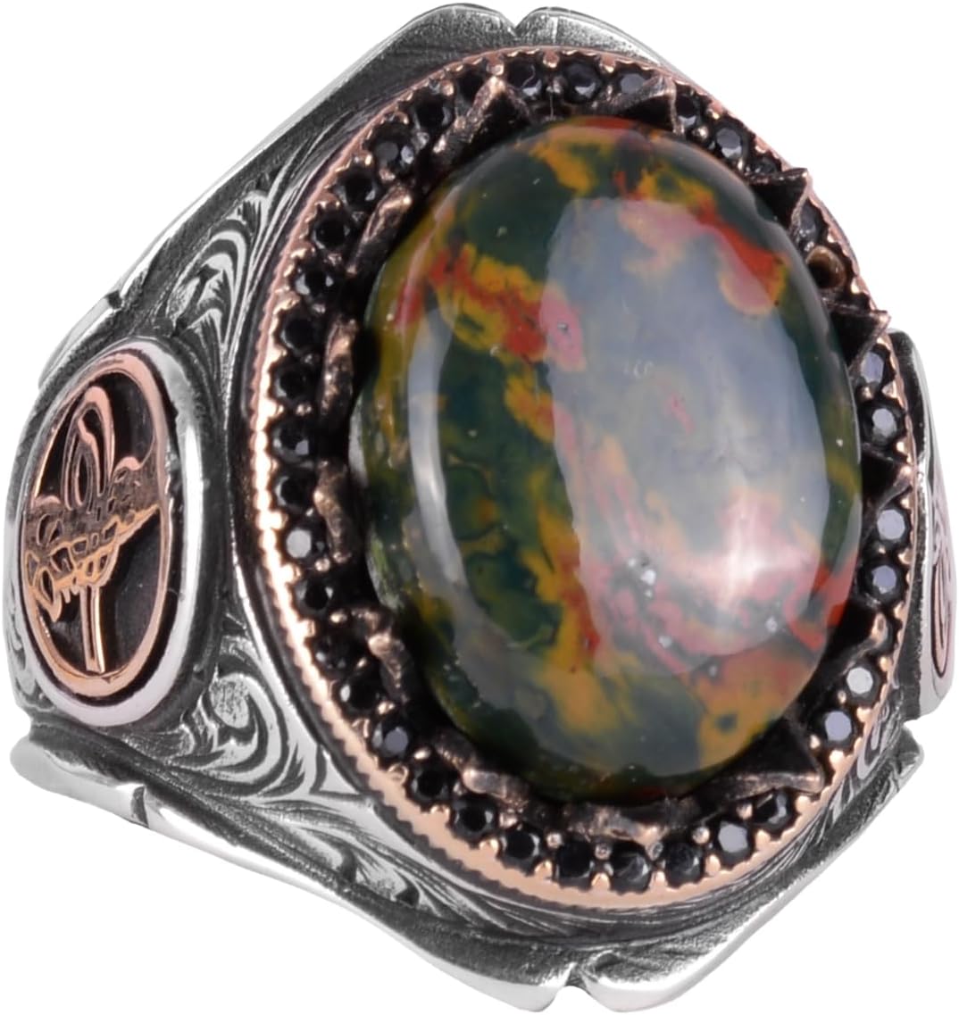 925 Ayar Sert Gümüş Erkek Yüzük Doğal Taşlarla - El Yapımı Zarafet (Yeşil Kan Taşı)