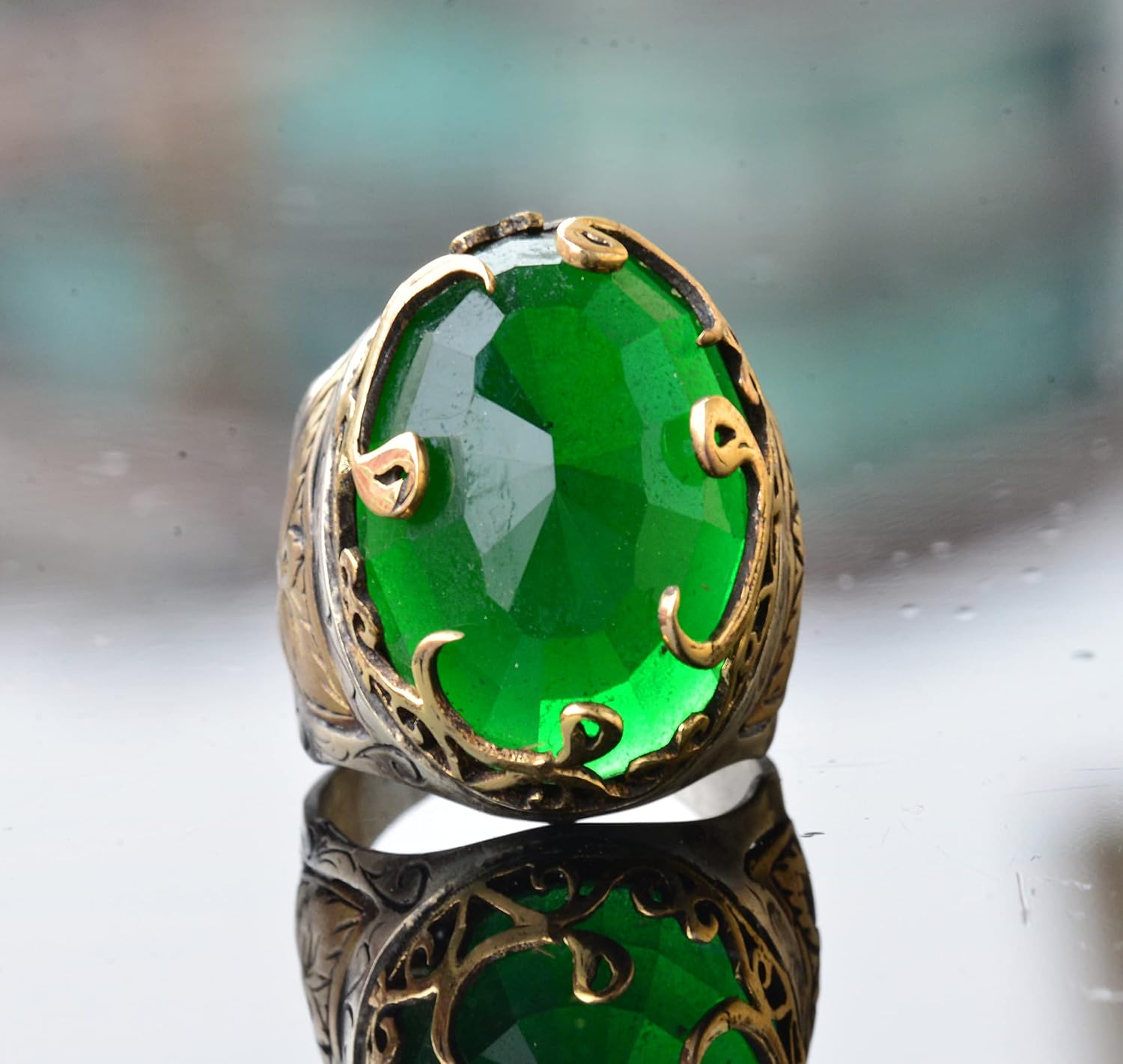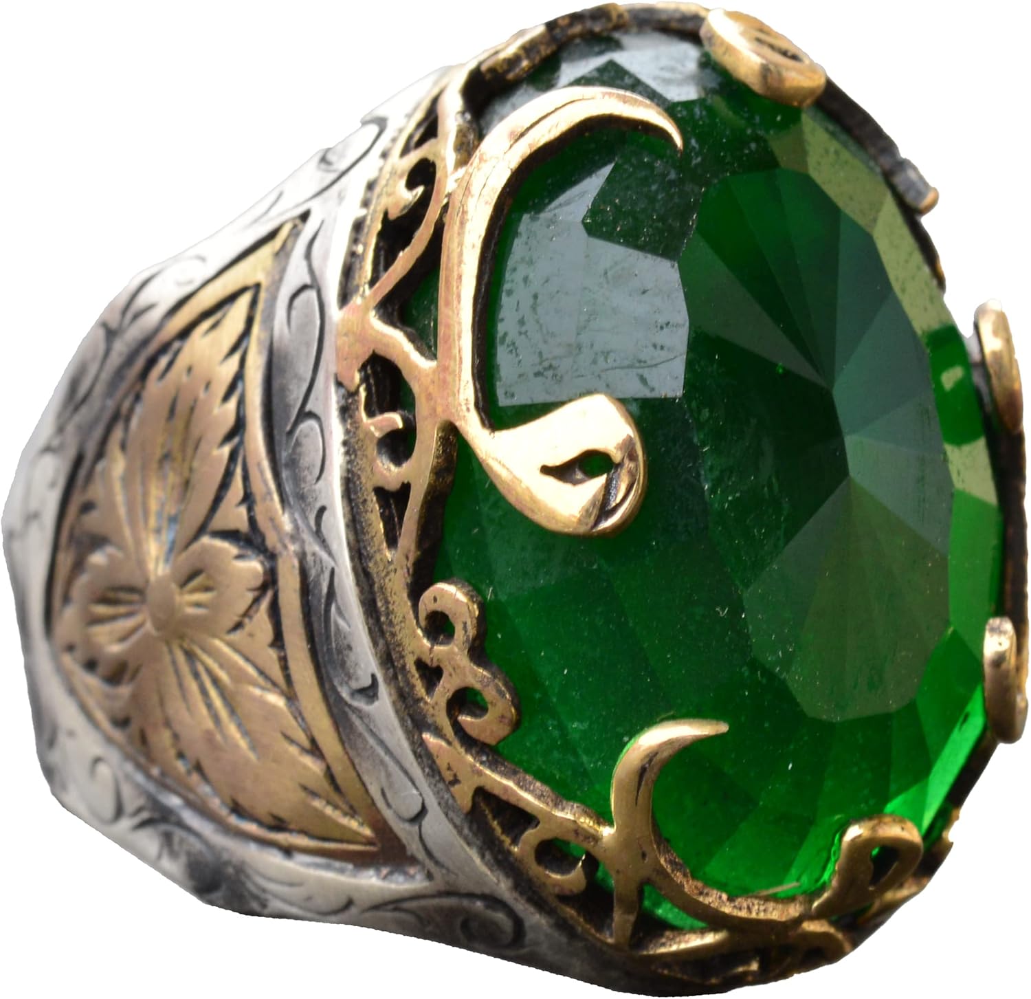 925 Ayar Sert Gümüş Erkek Yüzük, Yapay Zümrüt Taşlı Yüzük, Etnik Tasarım, Erkek Yüzük