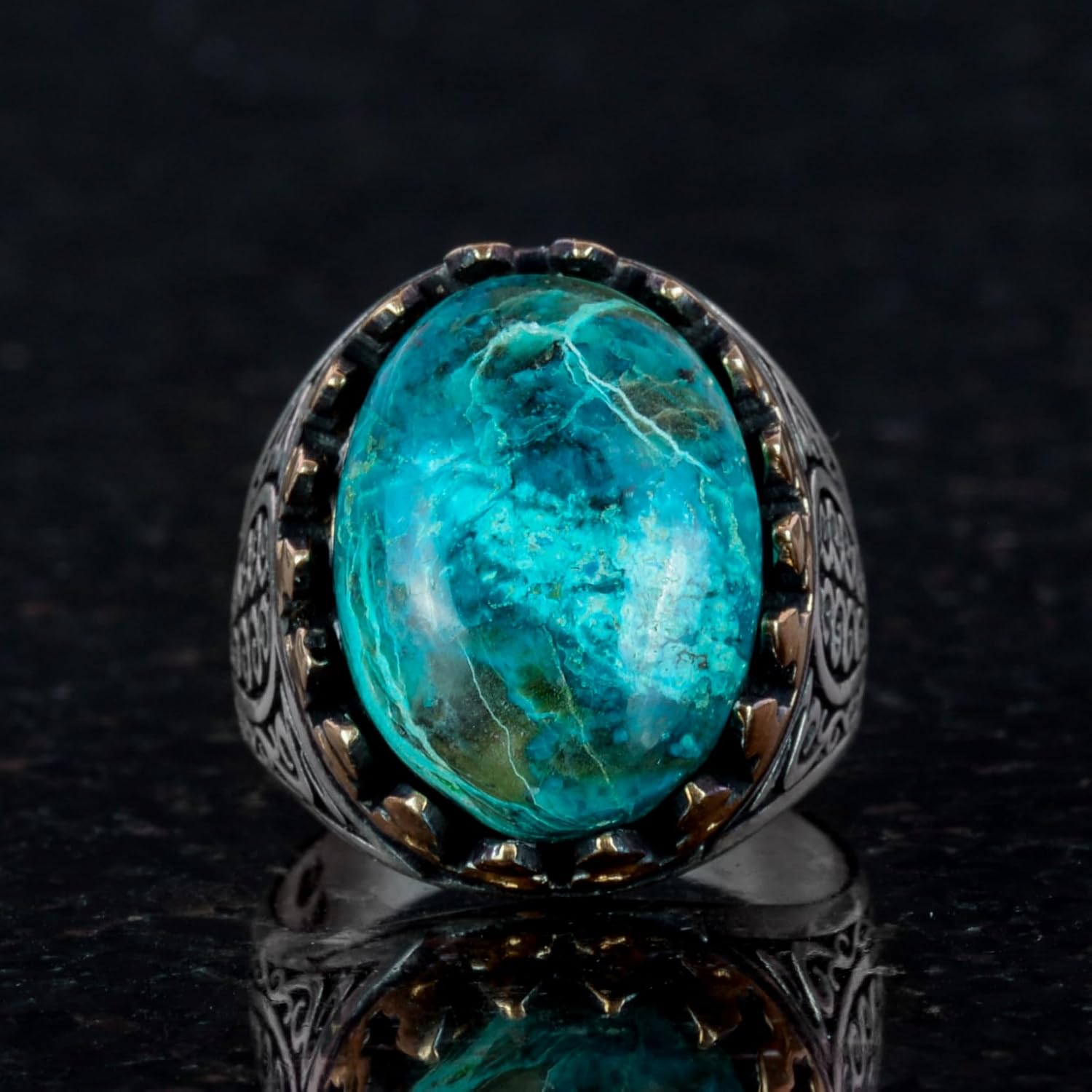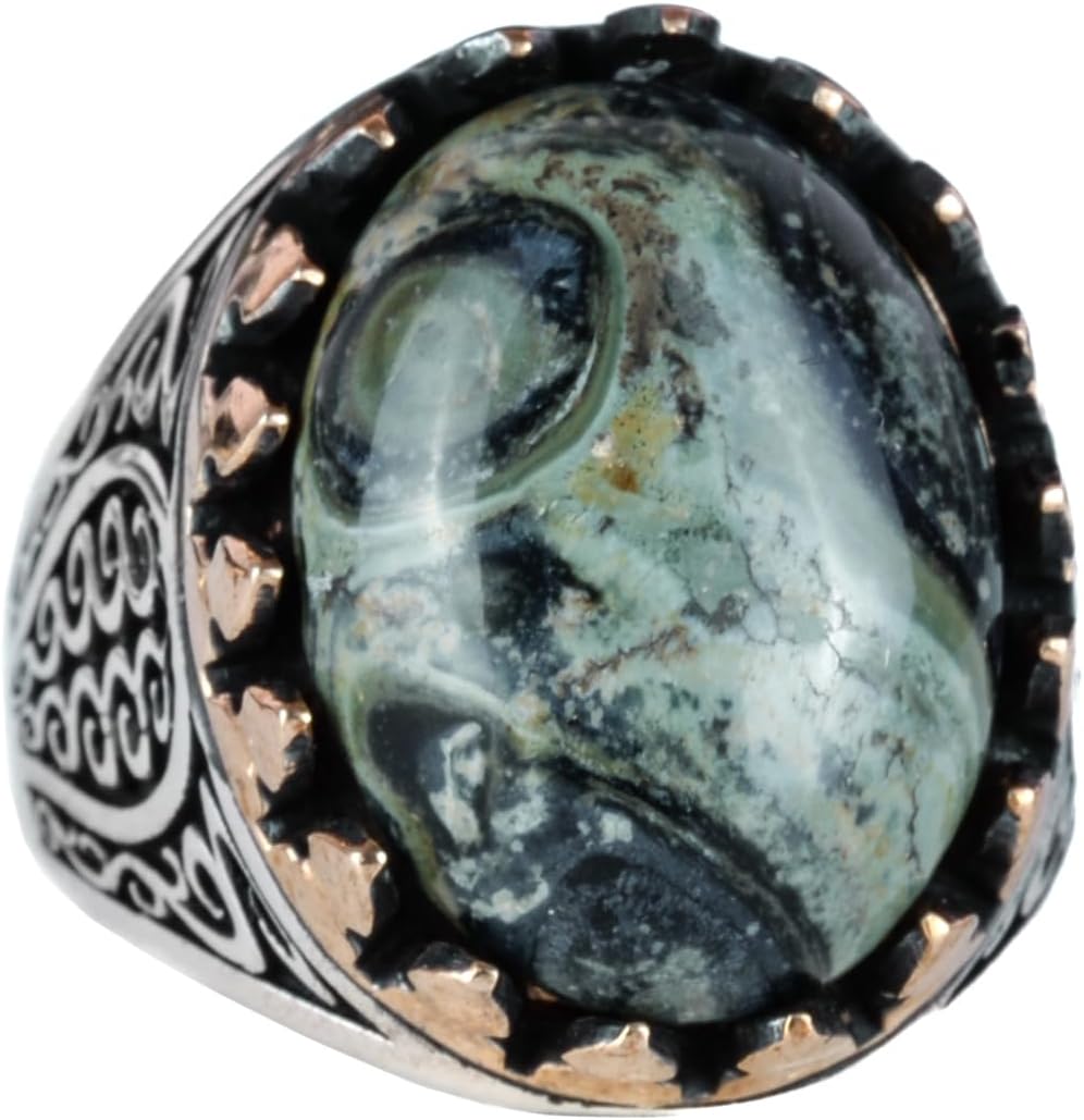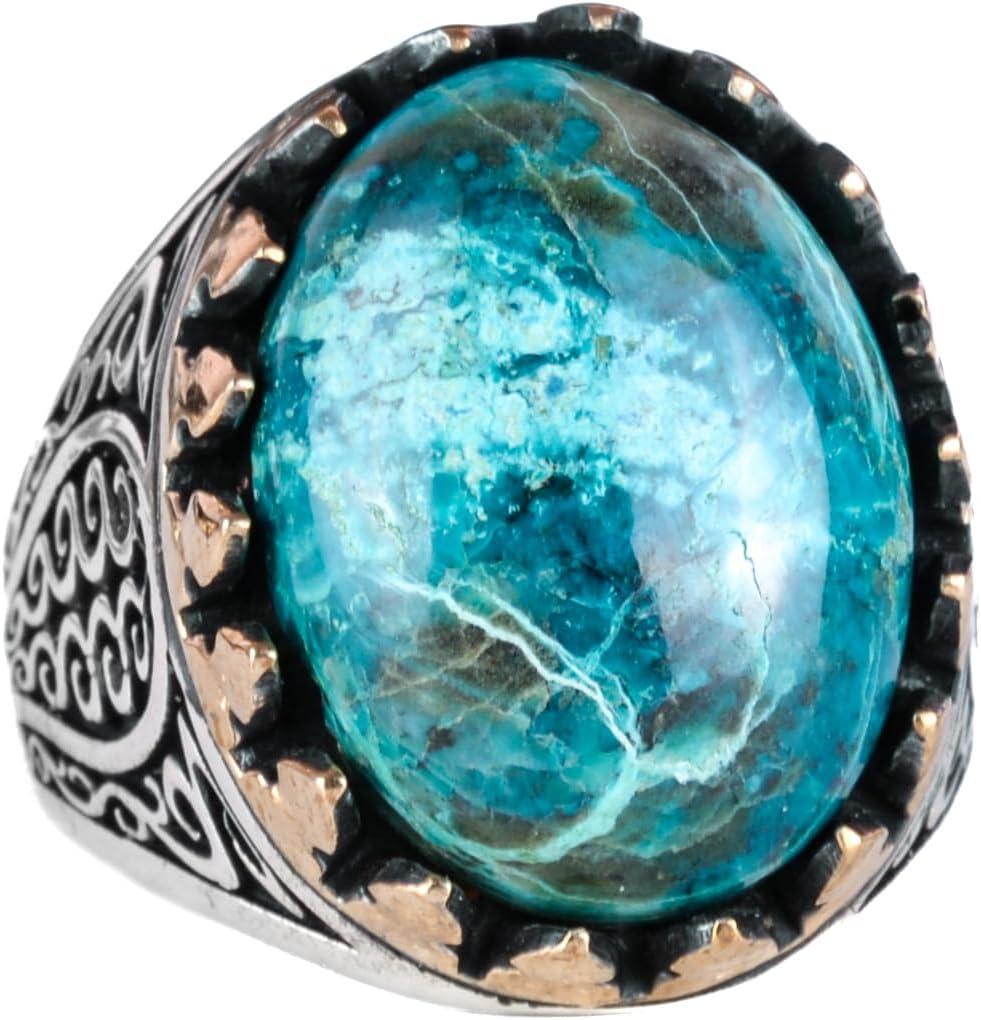 925K Katı Sterlin Gümüş Erkek Yüzüğü Doğal Taşlarla - El Yapımı Şıklık (Krisokolla Taşı)