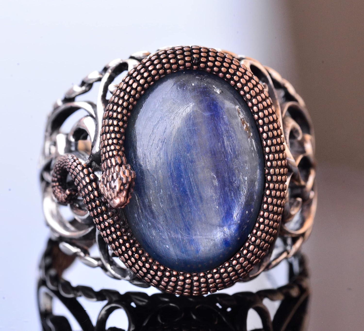925K Solid Sterling Silver Erkek Yüzüğü Doğal Taşlarla - El Yapımı Zarafet (Kyanit Taşı)
