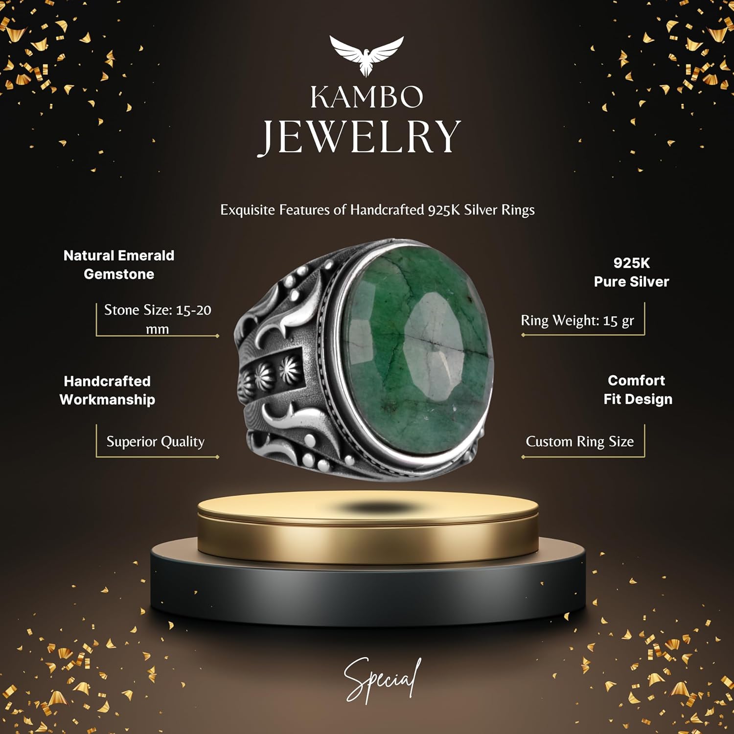 925K Saf Gümüş Erkek Yüzük, El Yapımı Doğal Zümrüt Taşlı Yüzük, Tasarım Gümüş Erkek Yüzük