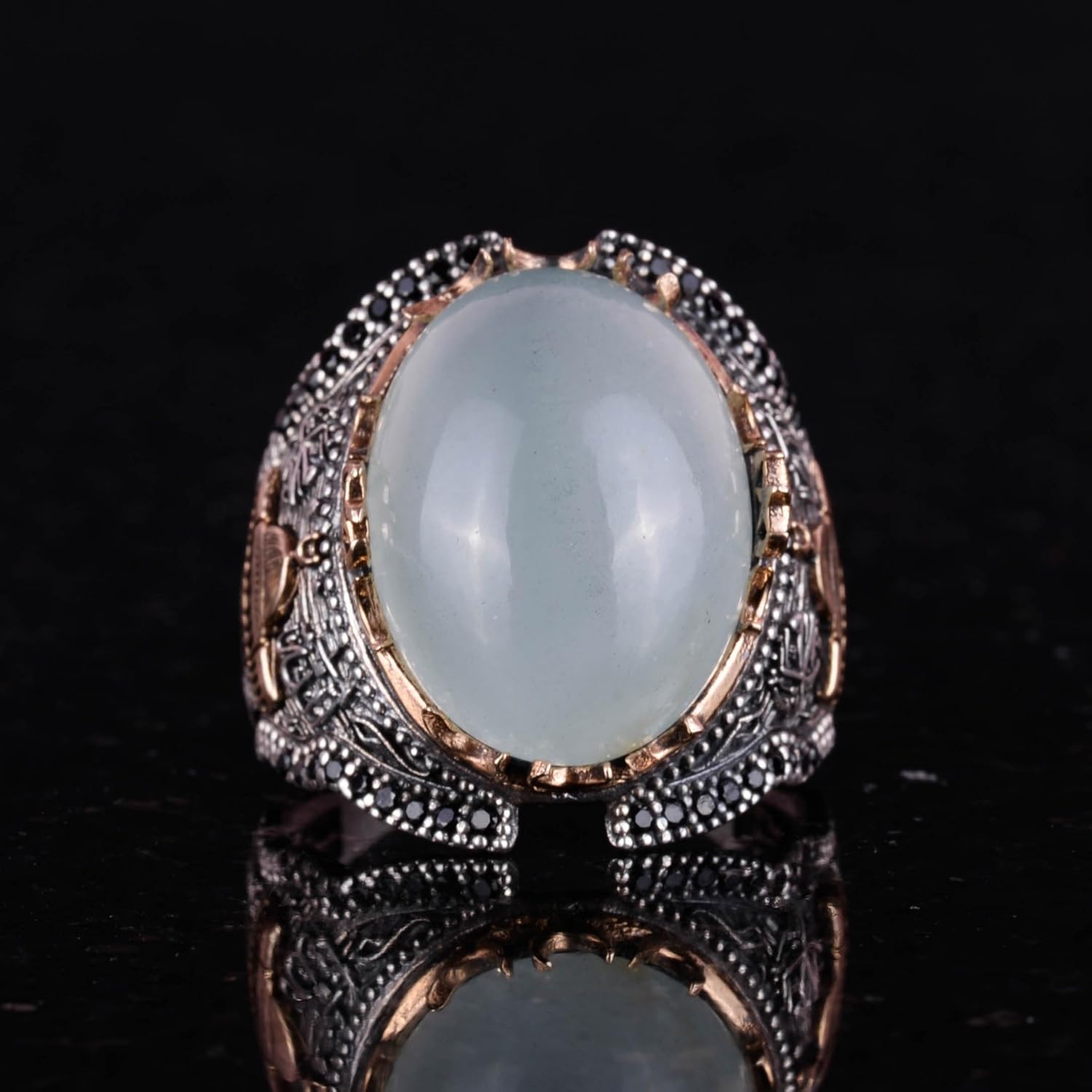 Cabochon Akuamarin Taş Yüzük, İslam Yüzüğü, 925 Ayar Katı Gümüş Erkek Yüzüğü, Huzur Denizi Tasarımı