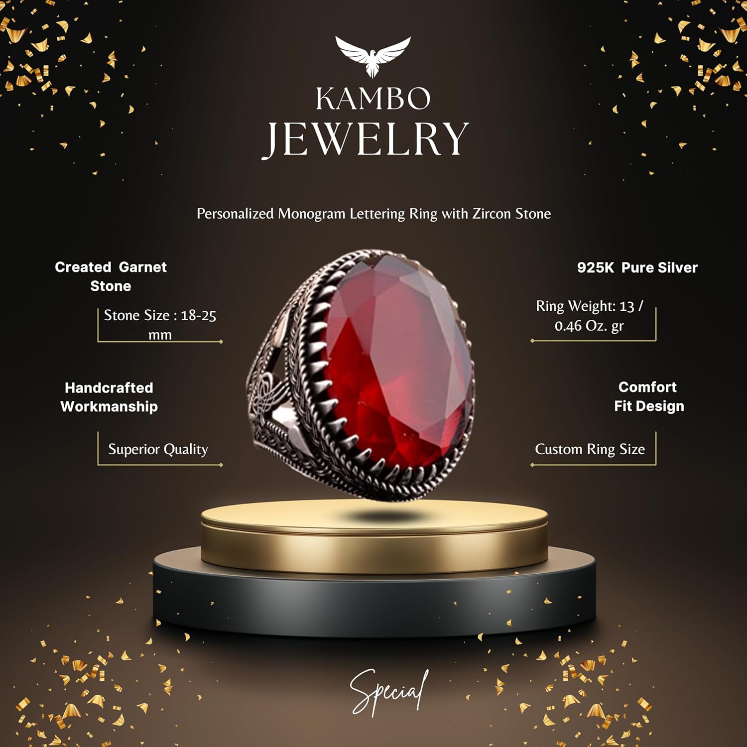 925 Ayar Gümüş Erkek Osmanlı Mühür Yüzük Yapay Granat Taşı ile