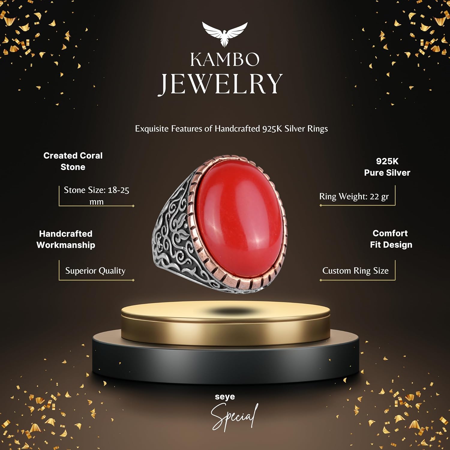 925 Ayar Gümüş Erkek Yüzüğü, Büyük Yüzük (Kırmızı Mercan Yapay Taş)