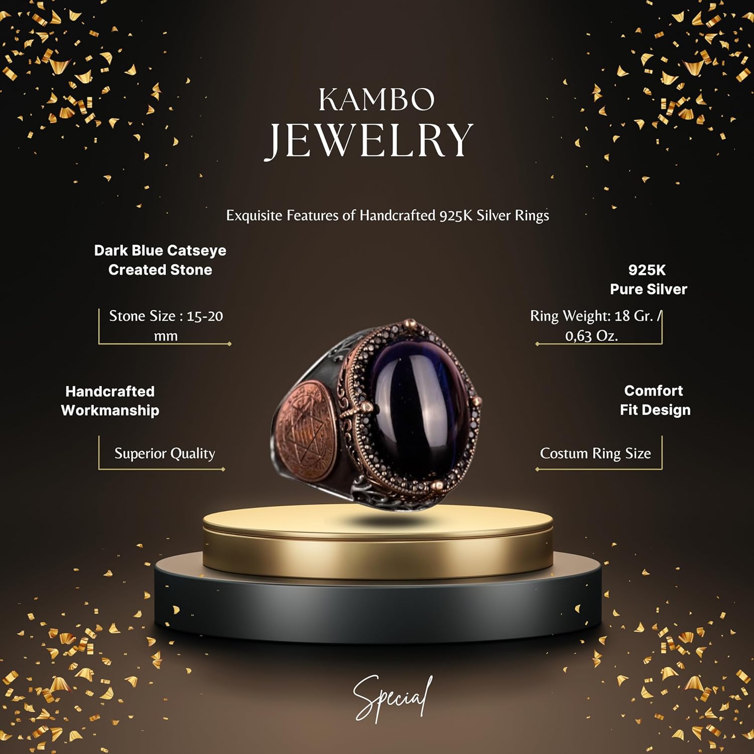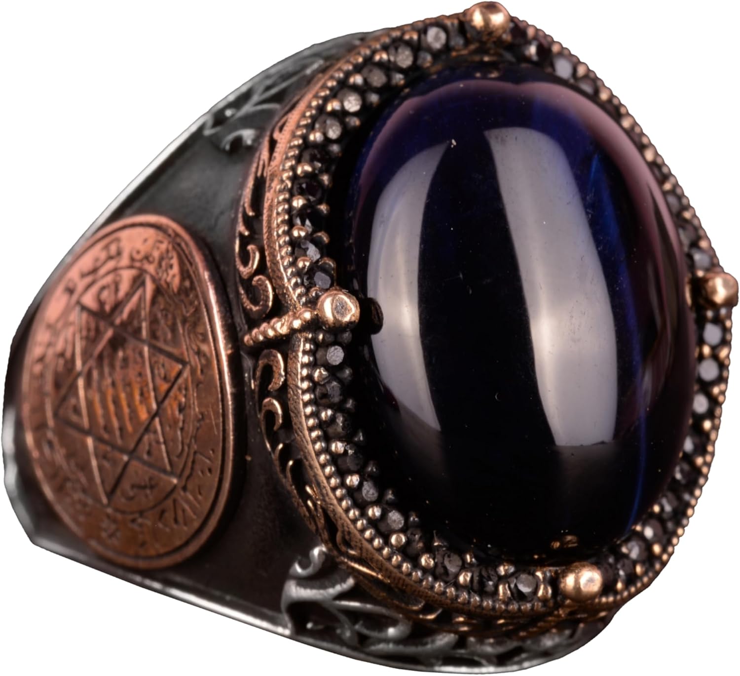 David Yıldızı Yüzüğü, Yapay Taş Yüzük, 925 Ayar Gümüş Süleyman Yüzüğü (Koyu Mavi Kedi Gözü Yapay Taş)