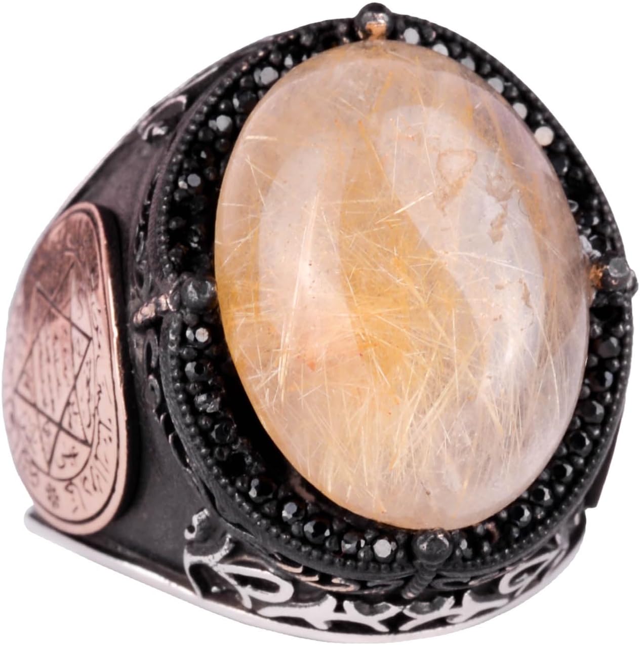 Davud Yıldızı Yüzüğü, Gerçek Doğal Cabochon Altın Rutilli Kuvars Taş Yüzüğü - 925K Katı Gümüş Erkek Yüzüğü