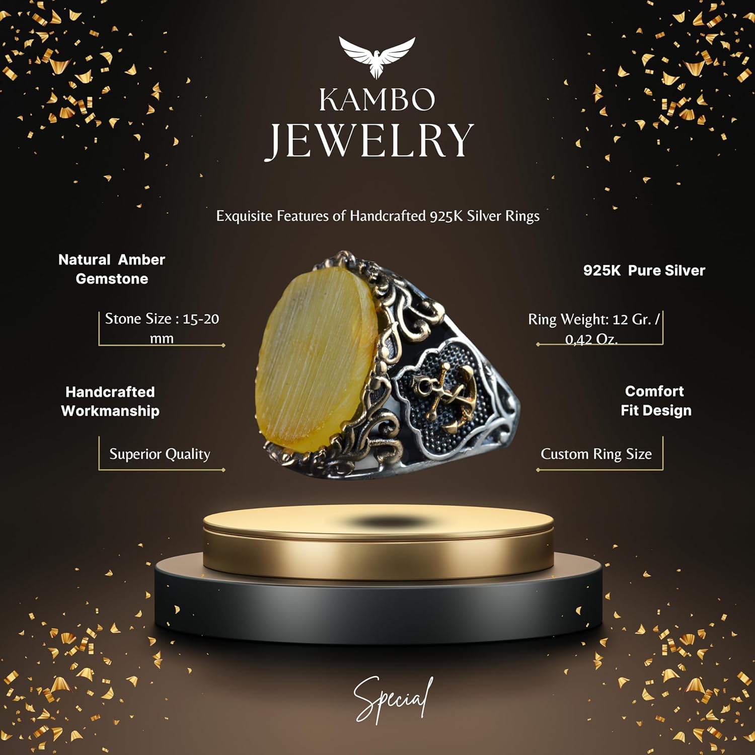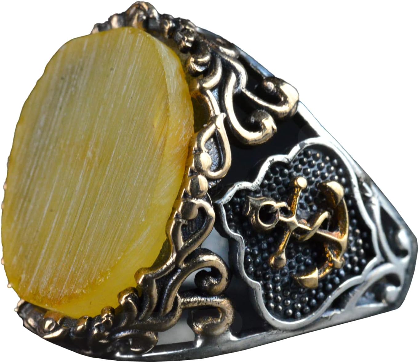 Denizci Çapa Gümüş Yüzük, Doğal Taş Yüzük, 925 Ayar Gümüş Yüzük (Kehribar)