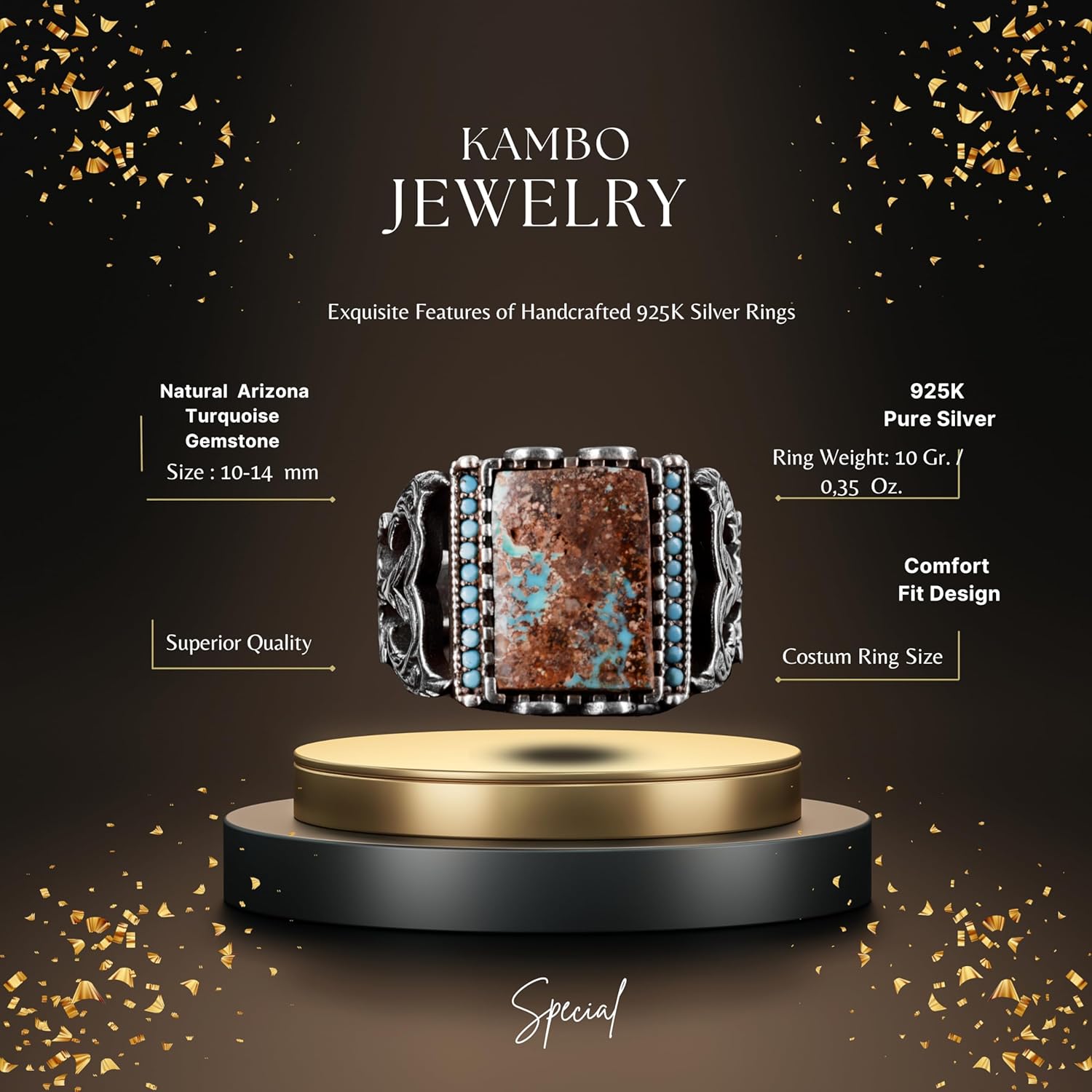 Dikdörtgen Gümüş Yüzük, 925 Doğal Arizona Turkuaz Taşlı Yüzük