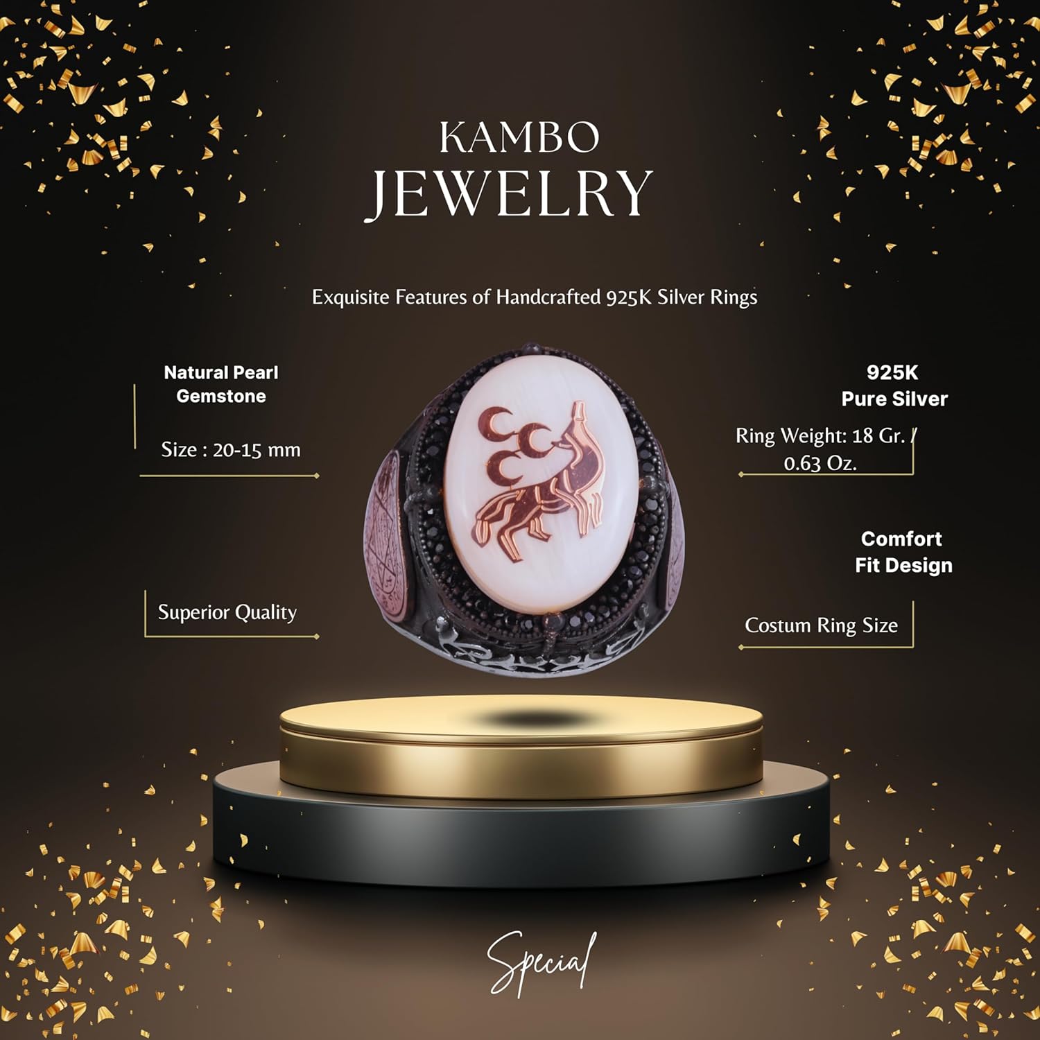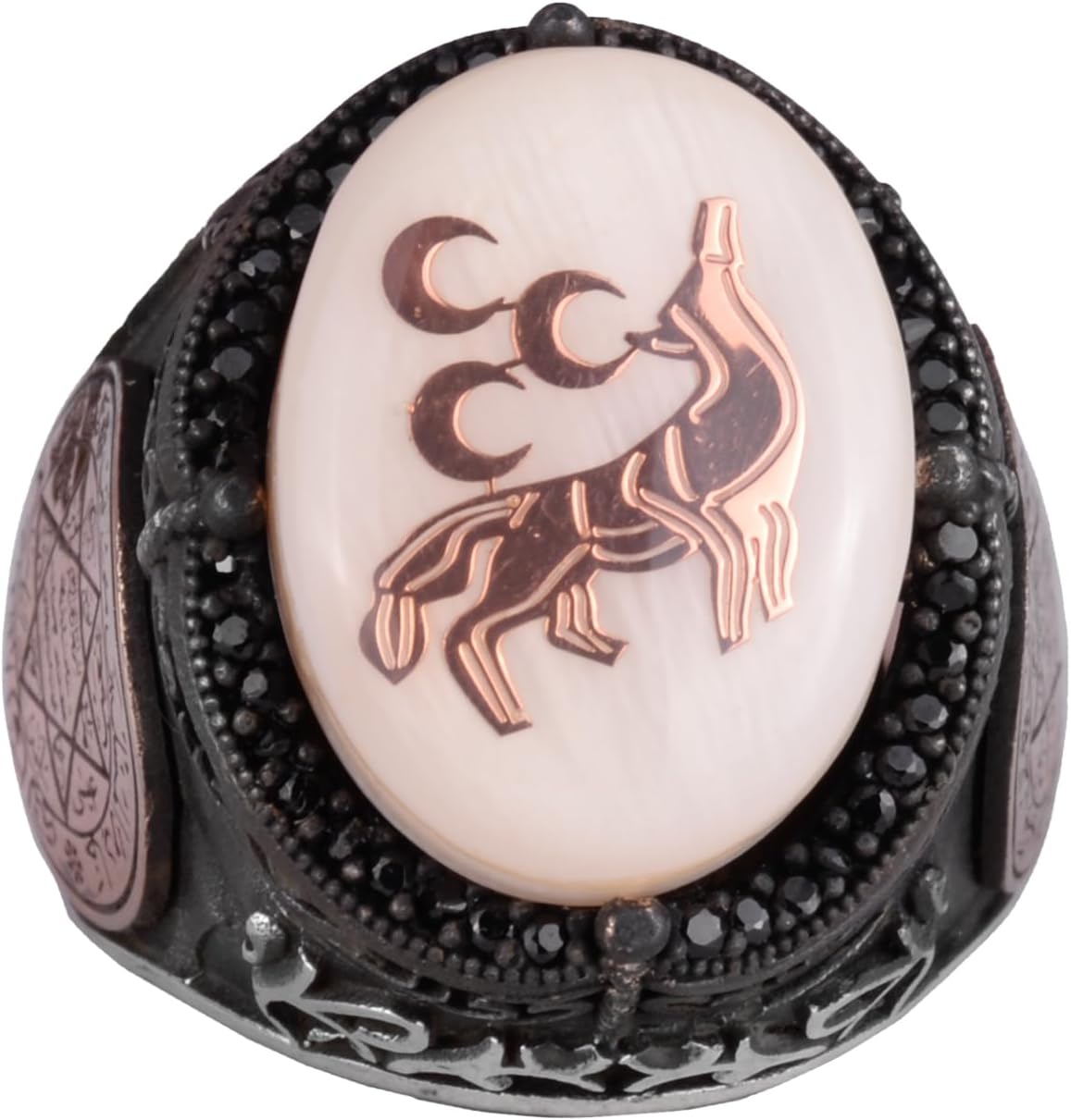 Desenli El Yapımı Yüzük - 925 Ayar Gümüş Erkek Yüzüğü - David Yıldızı Takısı (Kurt ve Üçlü Hilal)