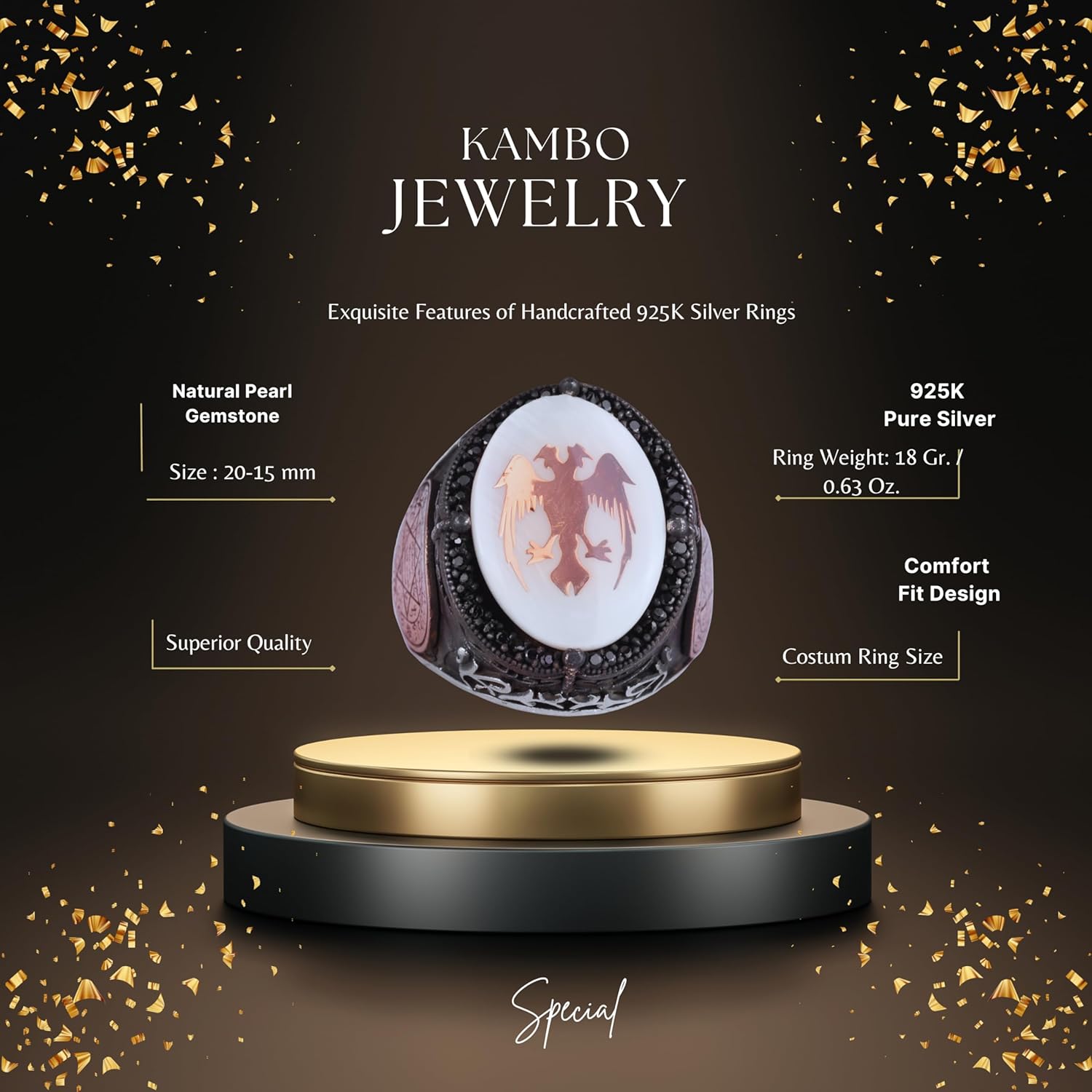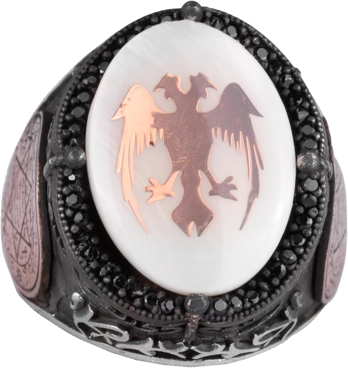 Doğal İnci Taşlı Yüzük - 925 Ayar Gümüş El Yapımı Erkek Yüzüğü - İki Başlı Kartal Tasarımı