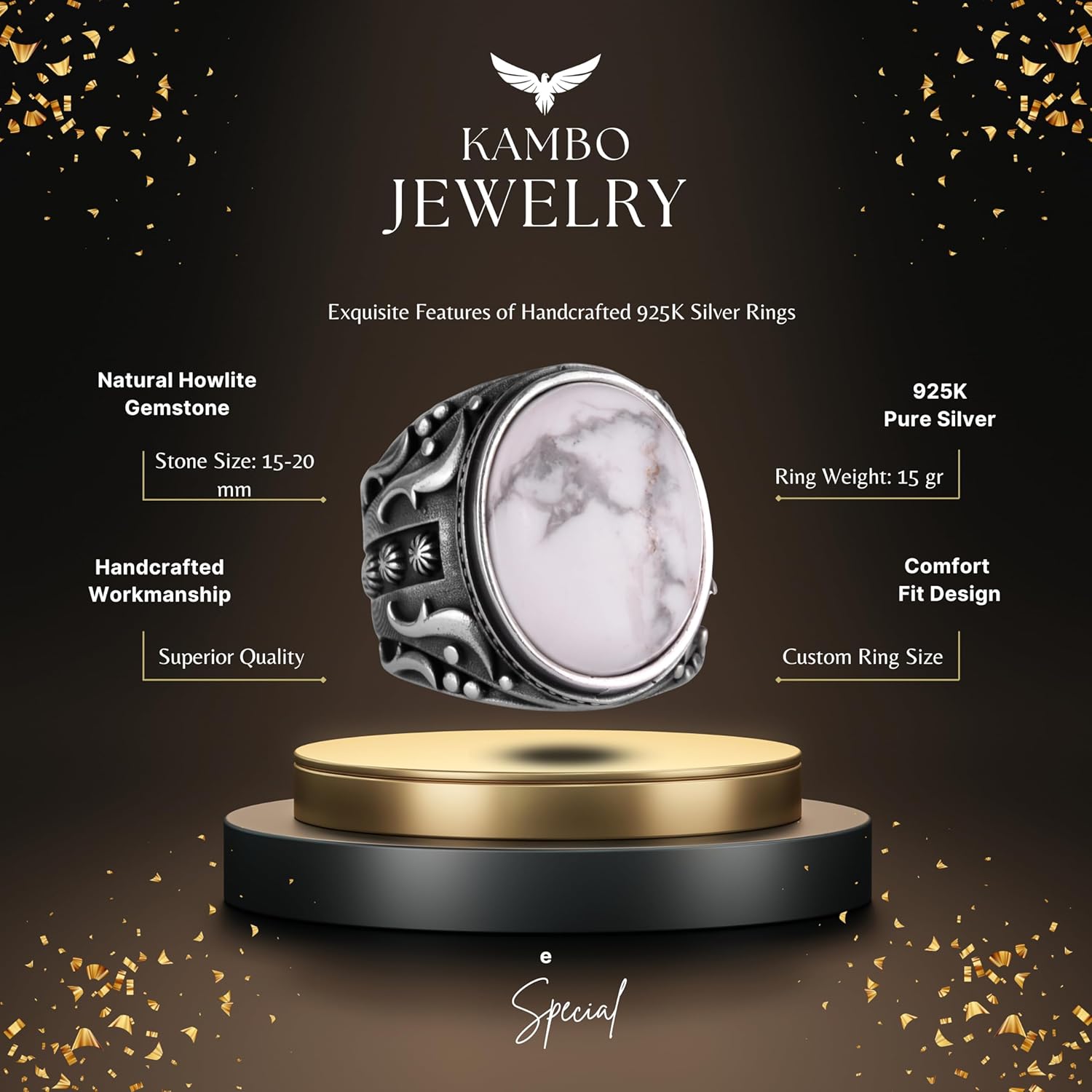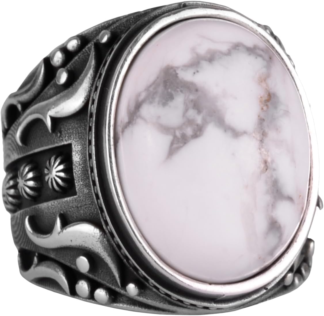 Doğal Howlite Taşlı Gümüş Yüzük, 925 Ayar Katı Gümüş Erkek Yüzüğü, Tasarım Gümüş Erkek Yüzüğü