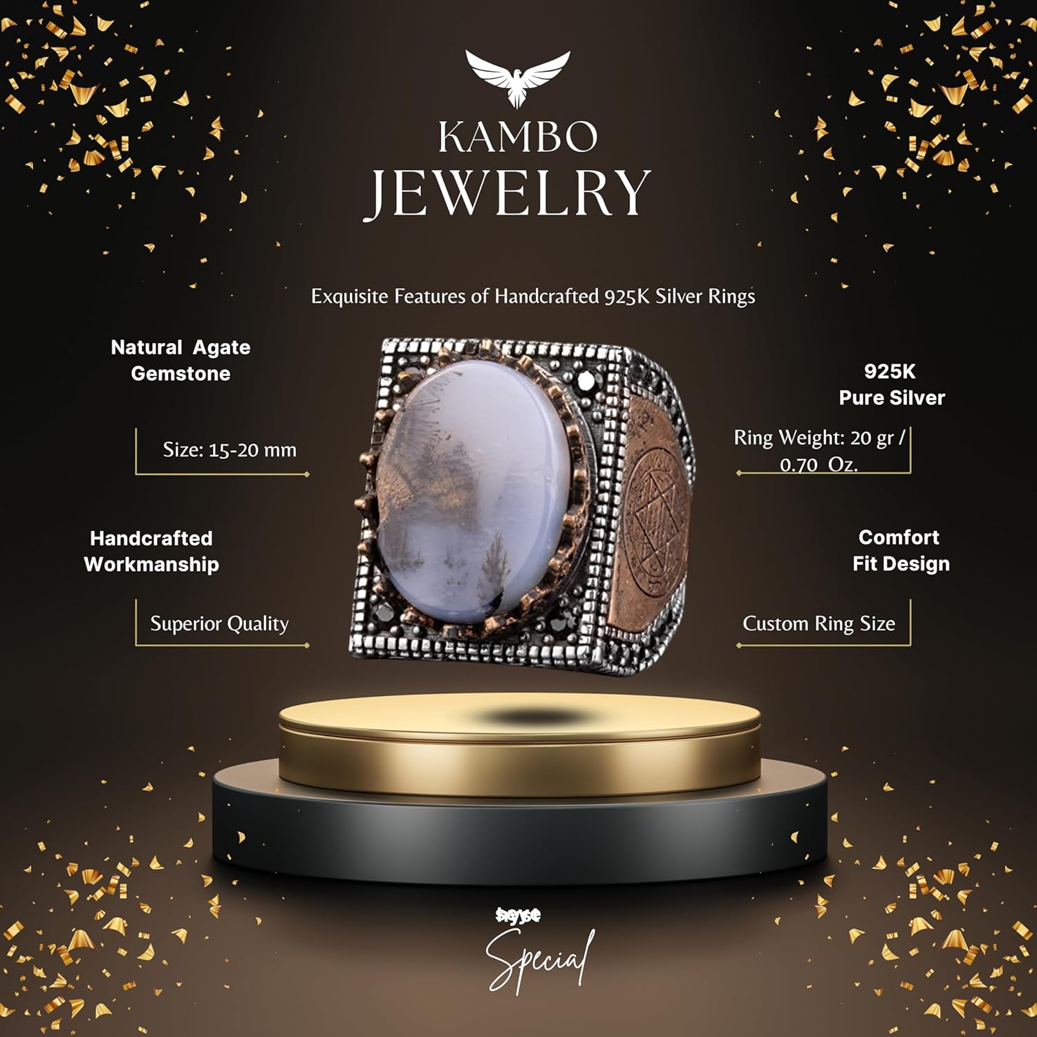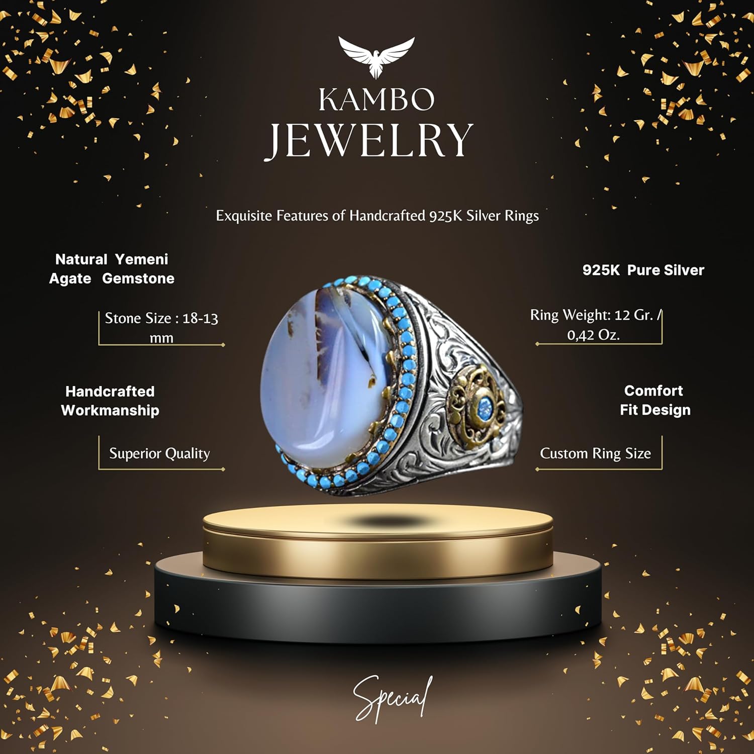 Doğal Yemen Akik Taşı Yüzük, El Yapımı 925 Ayar Gümüş Sultan Erkek Yüzüğü
