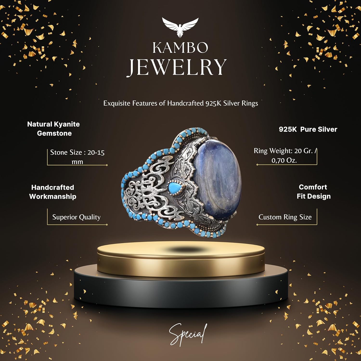 El Yapımı 925 Ayar Gümüş Erkek Yüzük - Doğal Taşlı (Kyanit) Orta Doğu Tasarımı