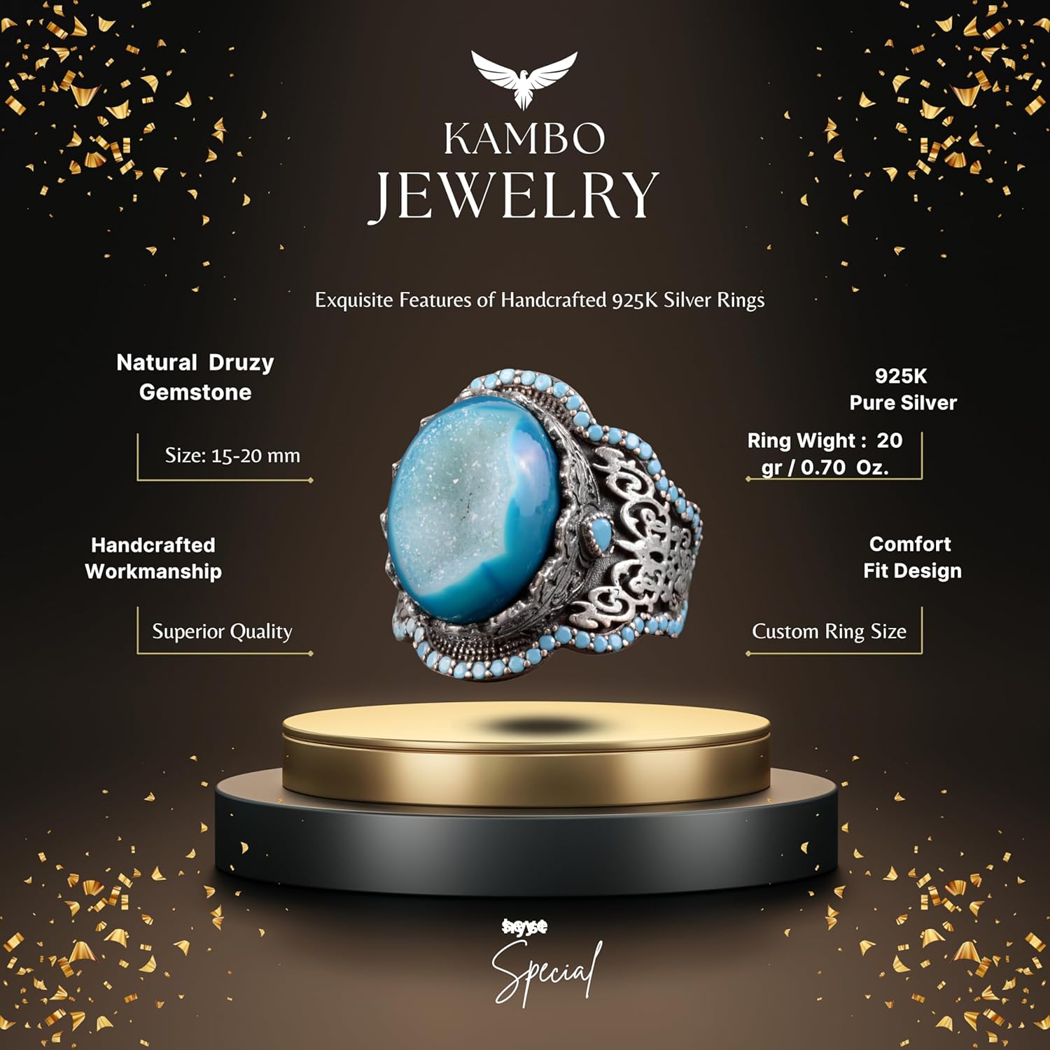 El Yapımı 925 Ayar Gümüş Erkek Yüzük - Doğal Taşlı (Drusy Kuvars)