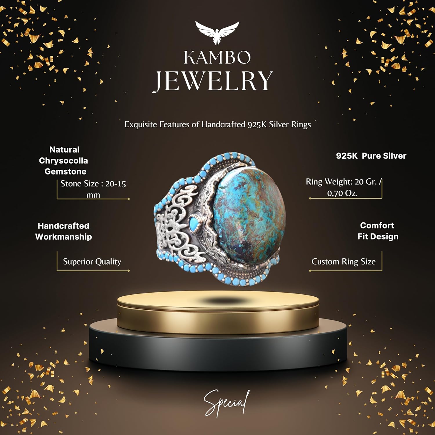 El Yapımı 925 Ayar Gümüş Erkek Yüzük - Doğal Taş (Krisokolla)