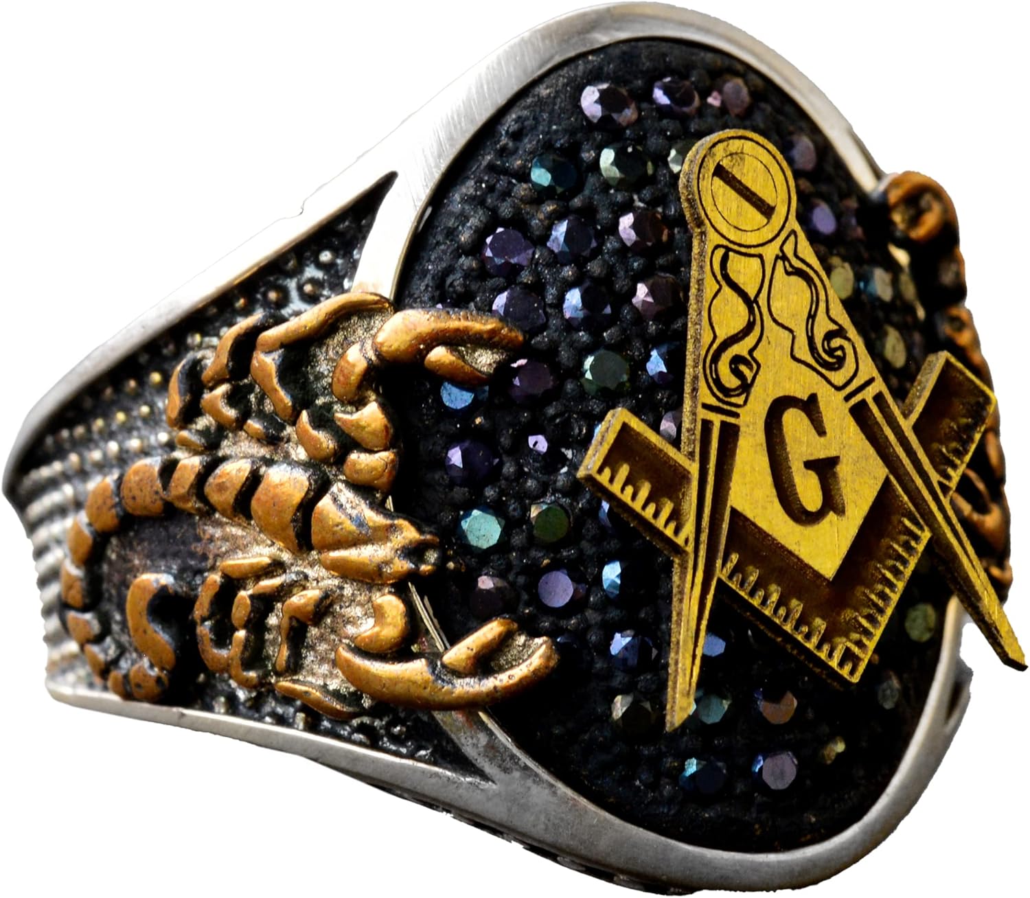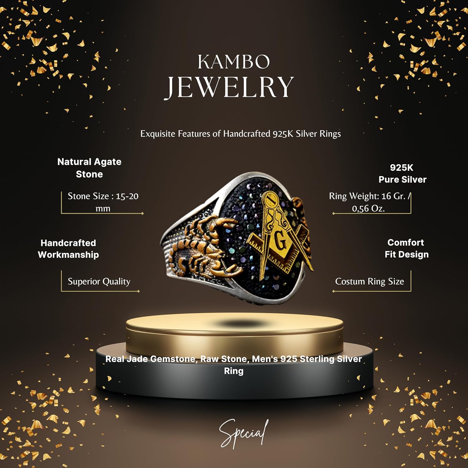 El Yapımı 925 Ayar Gümüş Erkek Mason Akrep Yüzüğü Siyah Akyürek Taşı ile, Mason Altın Kaplama Kral Yüzük Tasarımı, Gümüş Yüzük