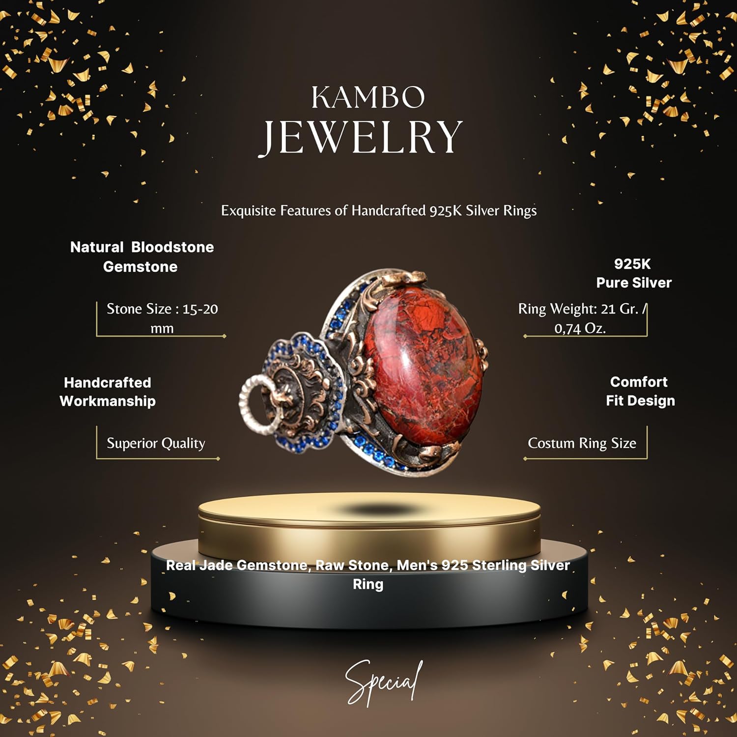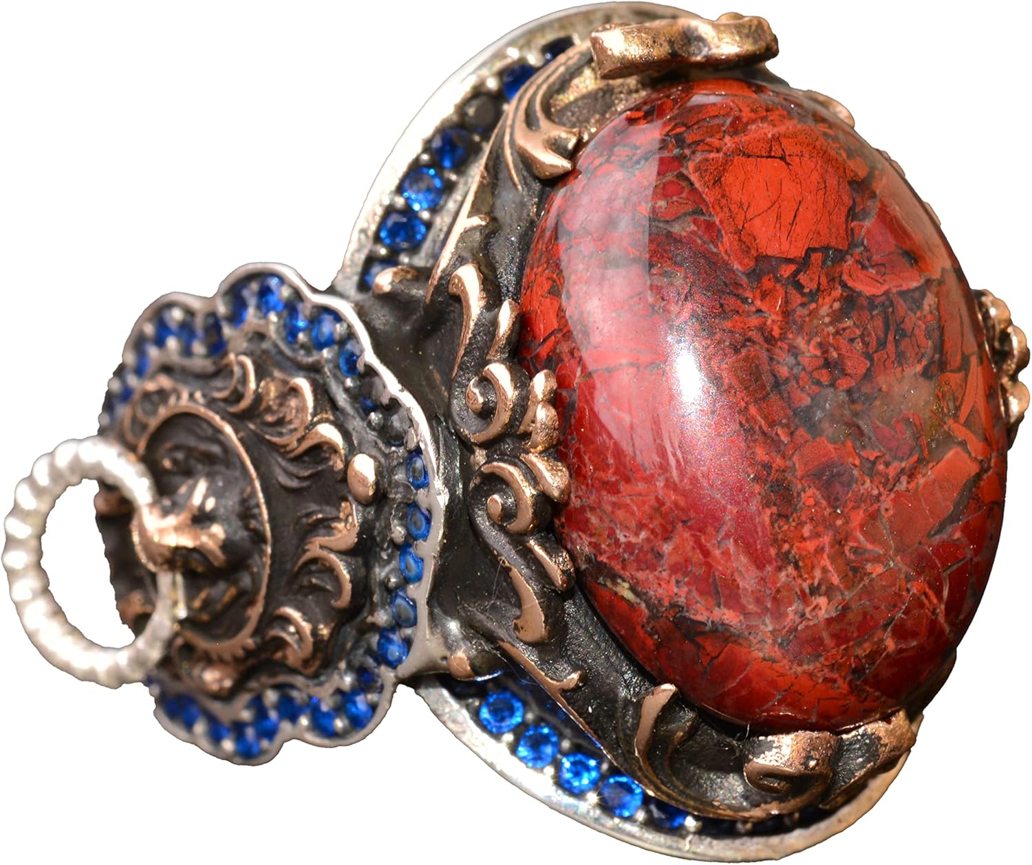 El Yapımı 925 Ayar Gümüş Erkek Yüzük, Gerçek Kan Taşı Yüzük, Aslan Tasarımı, Altın Kaplama Doğum Taşı Yüzüğü (Kan Taşı)