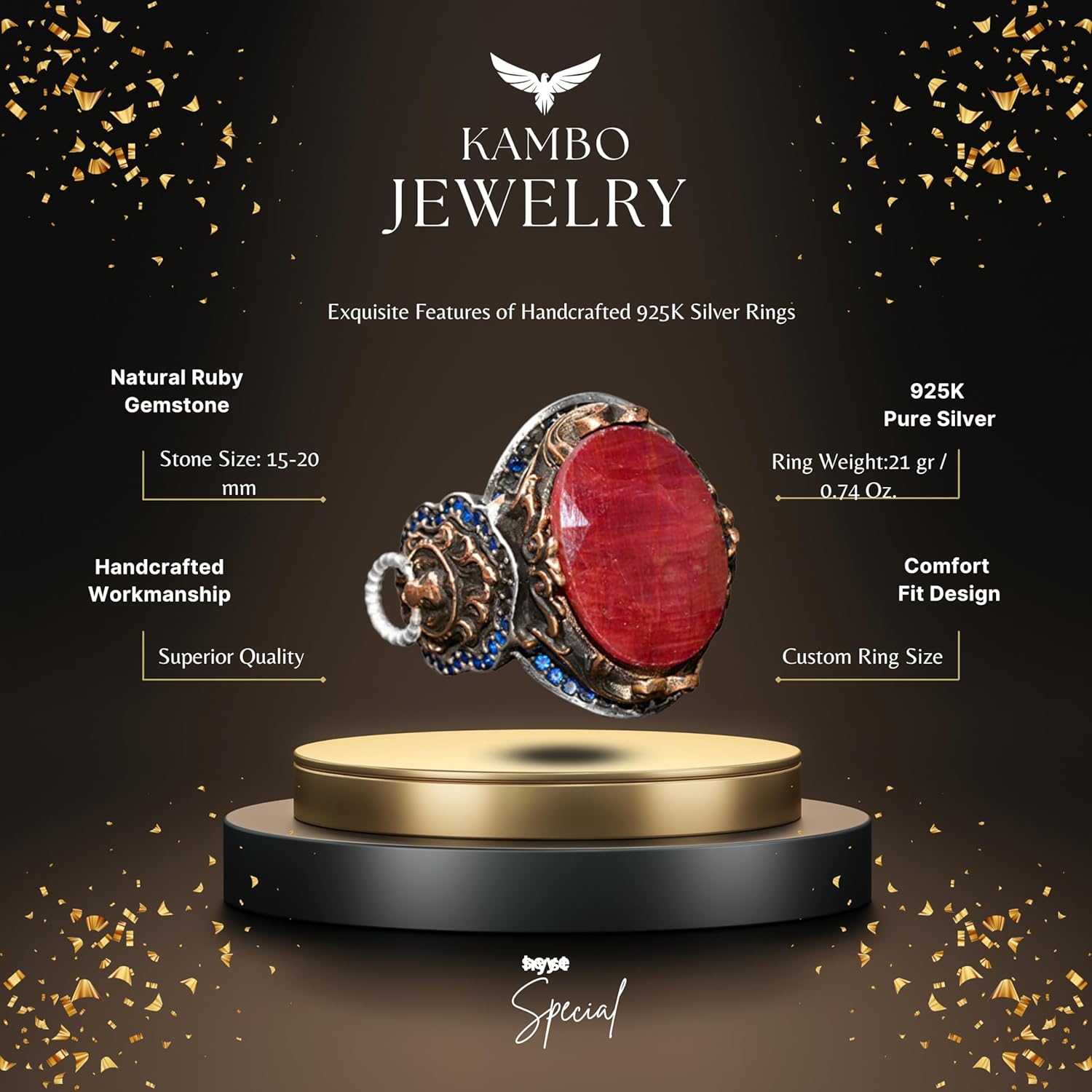 El Yapımı 925 Ayar Gümüş Erkek Yüzük, Gerçek Taşlı Yüzük, Aslan Tasarımı, Altın Kaplama Doğum Taşı Yüzüğü (Doğal Yakut)