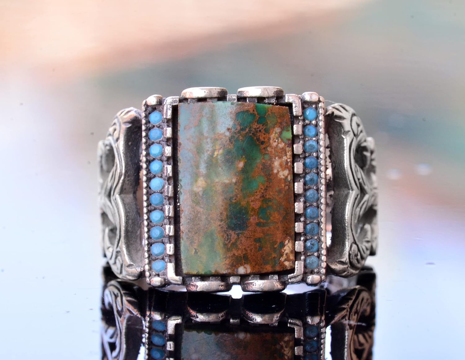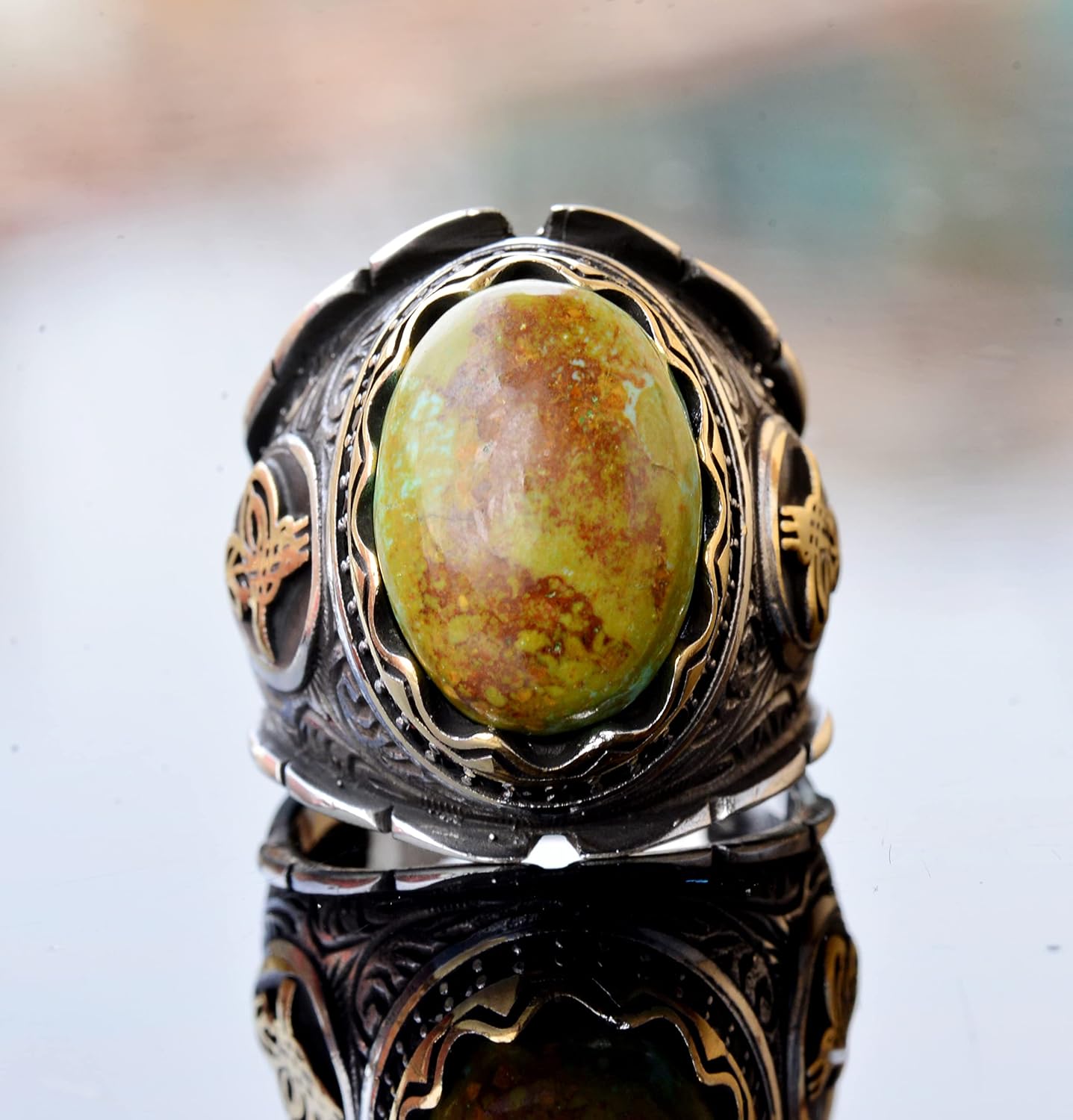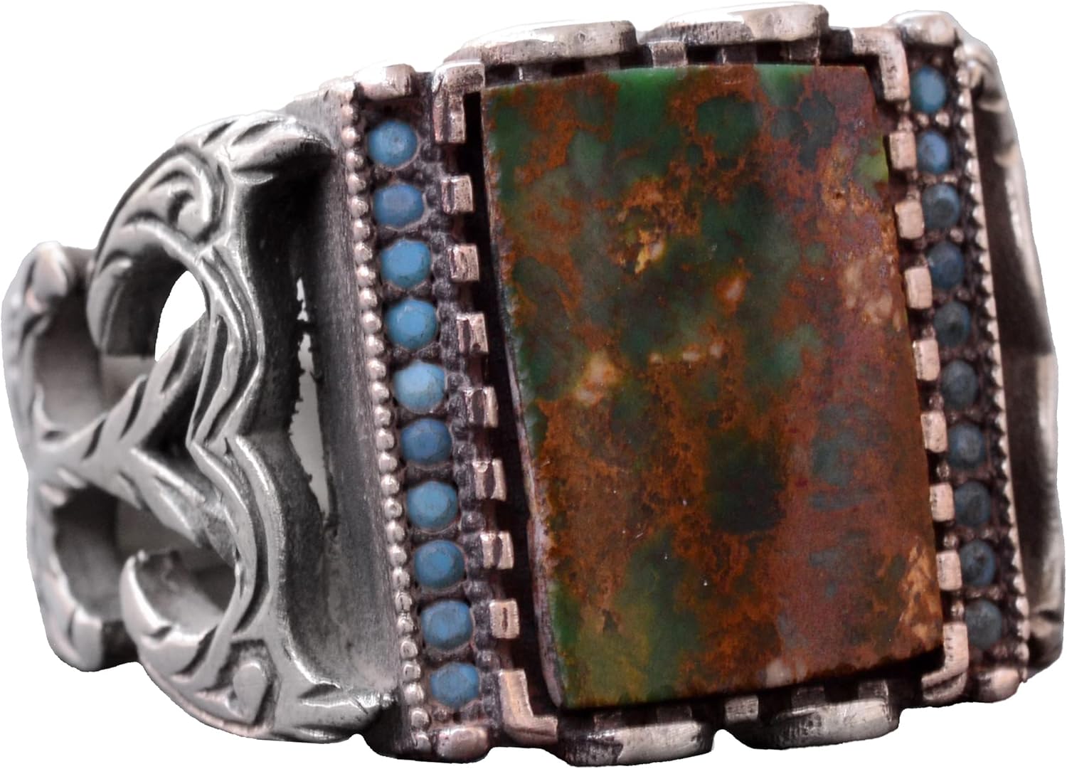 El Yapımı 925 Ayar Gümüş Erkek Yüzük, Gerçek Arizona Turkuaz Taşı - Karmaşık Osmanlı İşlemeli Tasarım - Özgün Gümüş Yüzük
