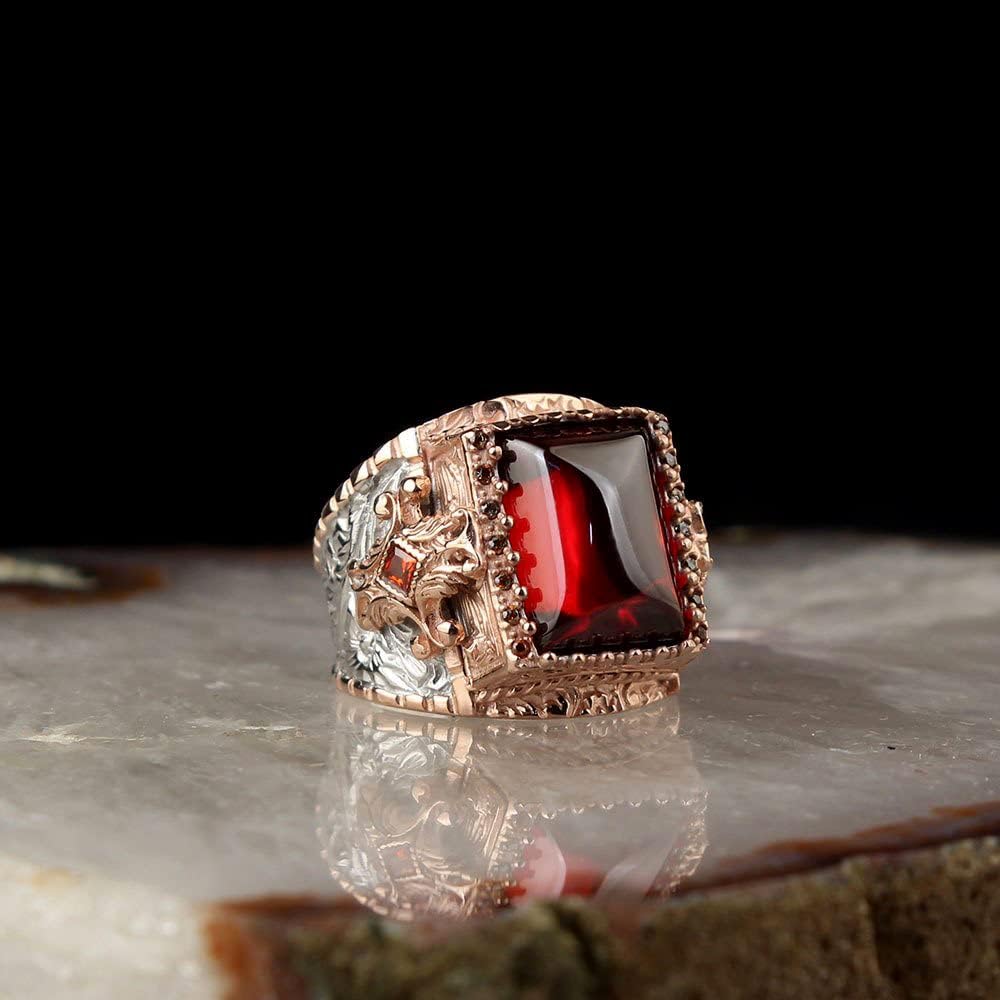 El yapımı 925 Ayar Gümüş Erkek Yüzük, Kırmızı Zirkon Taşı, Rodaj Kaplama Vintage Tasarım, Özel Takı