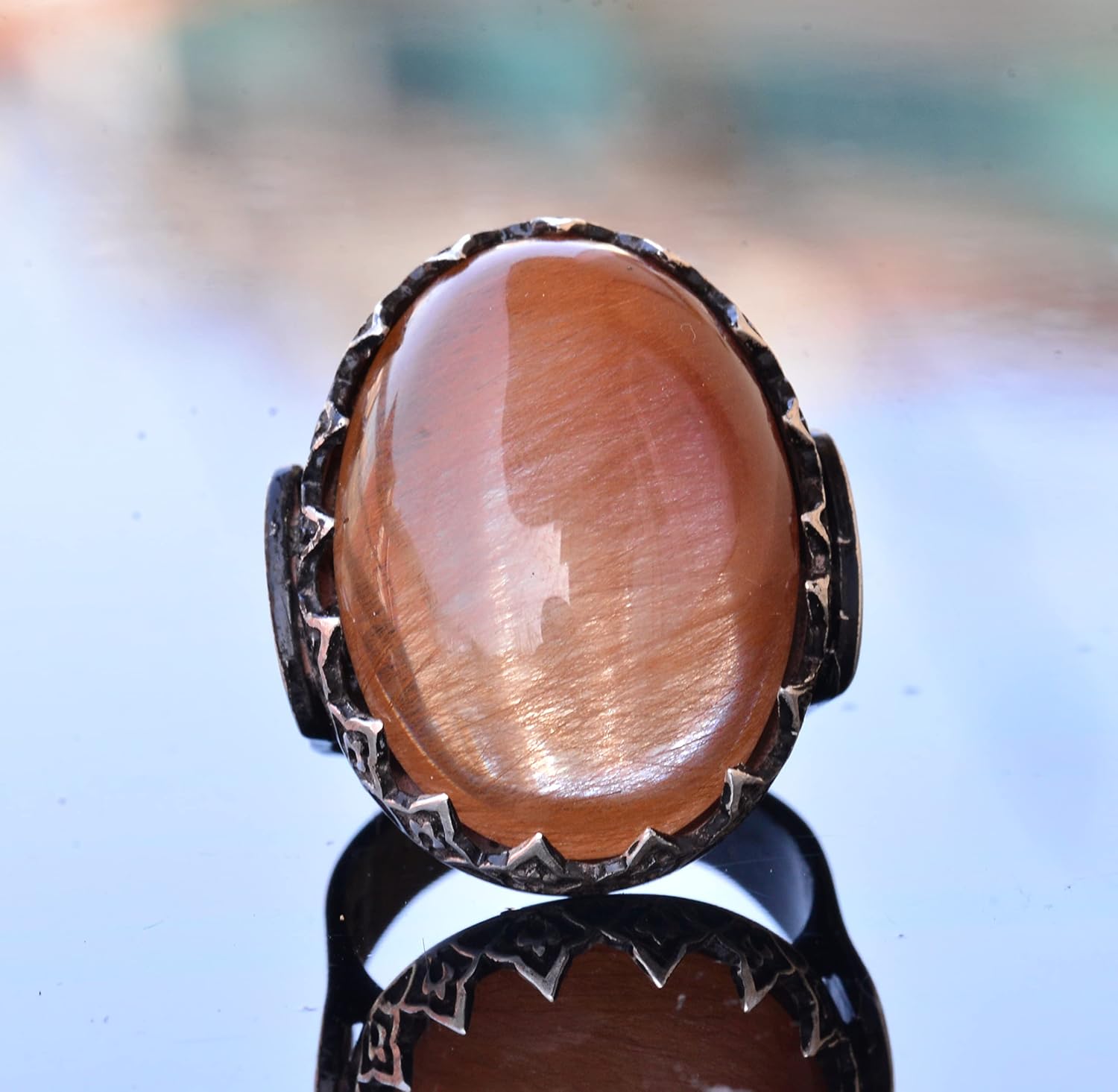 El Yapımı 925 Ayar Gümüş Erkek Yüzük, Gerçek Mavi Safir Taşı - Karmaşık Osmanlı İşlemeli Tasarım, Ortadoğu Etkili Yüzük