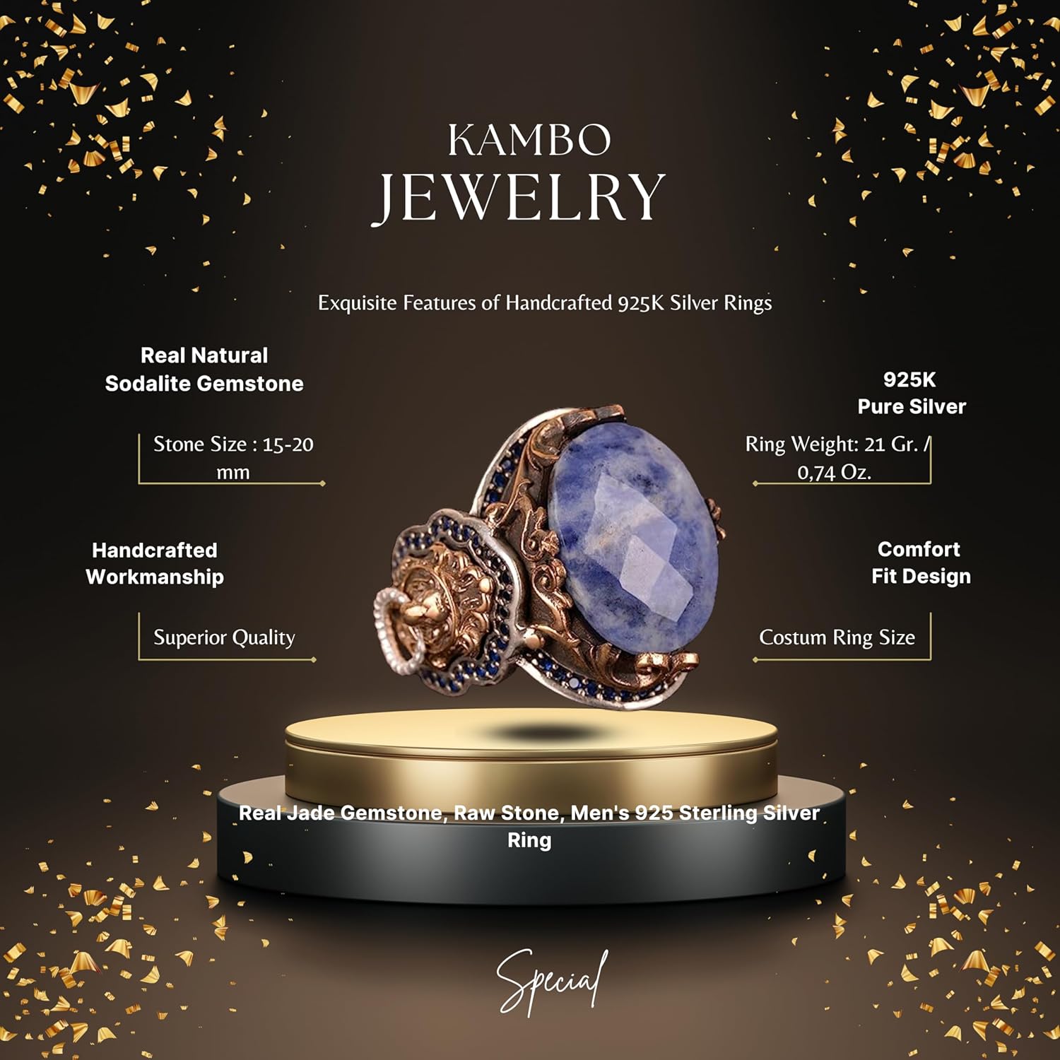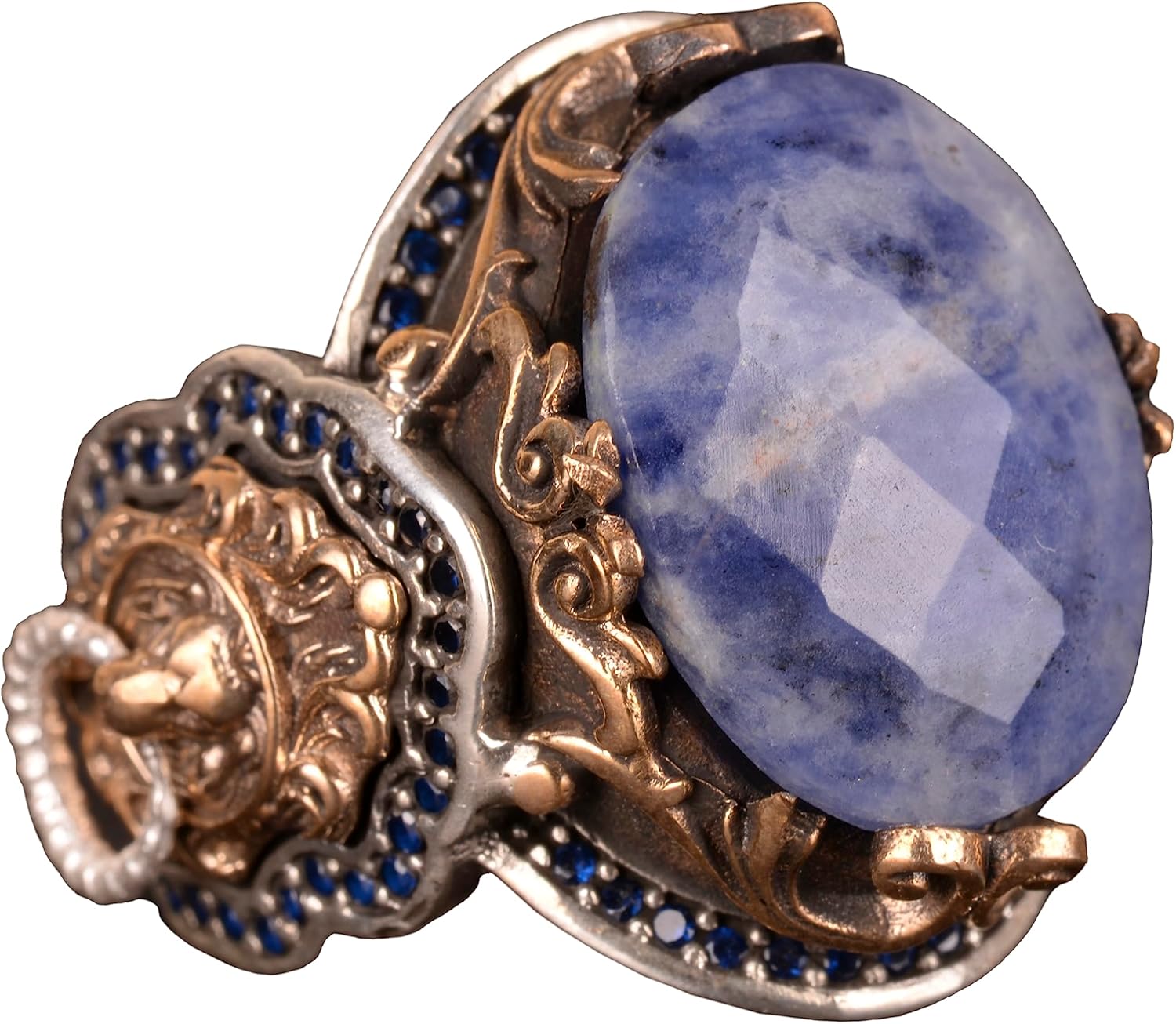 El Yapımı 925 Ayar Gümüş Erkek Yüzük, Gerçek Taş Yüzük, Aslan Tasarımı, Altın Kaplama Doğum Taşı Yüzüğü (Sodalit)