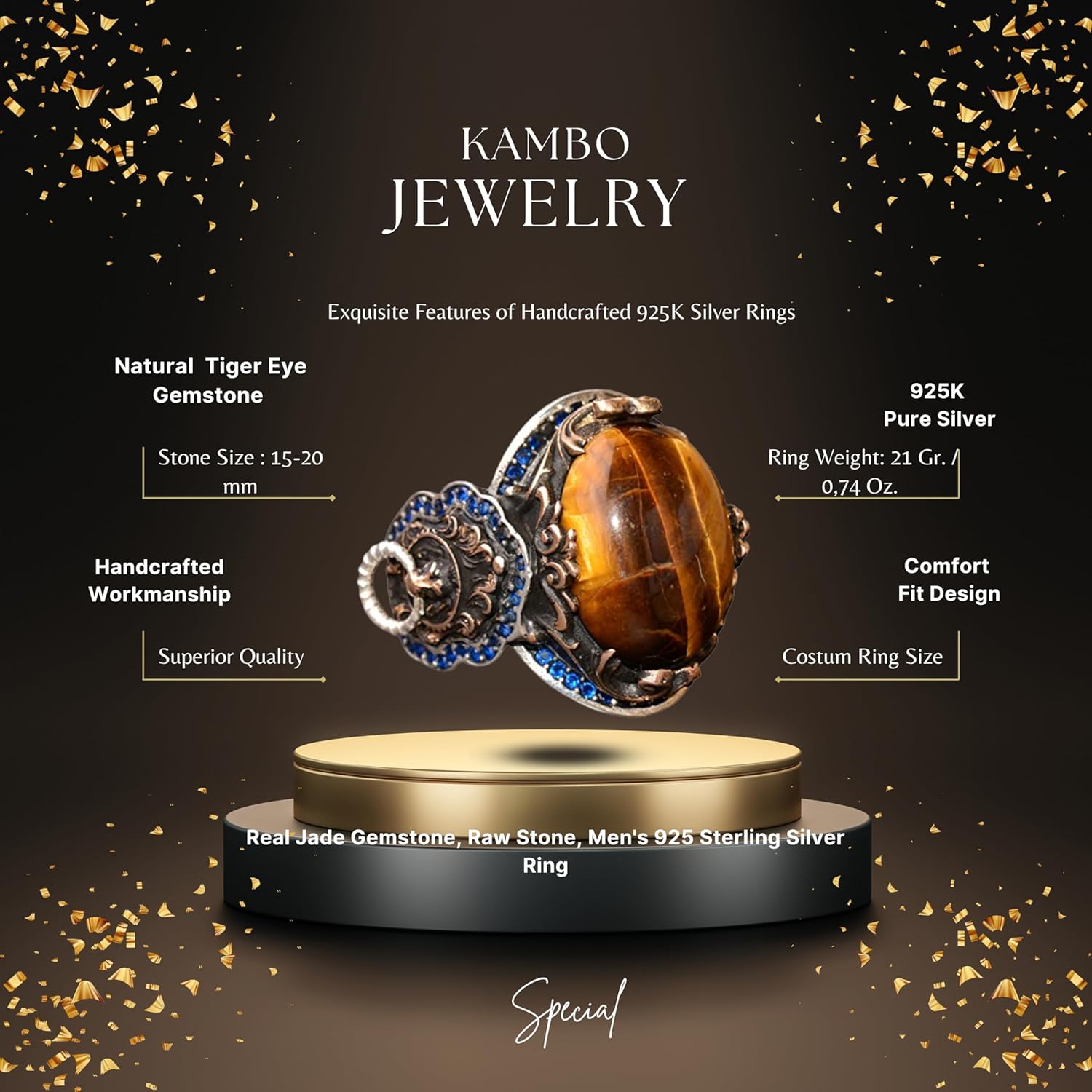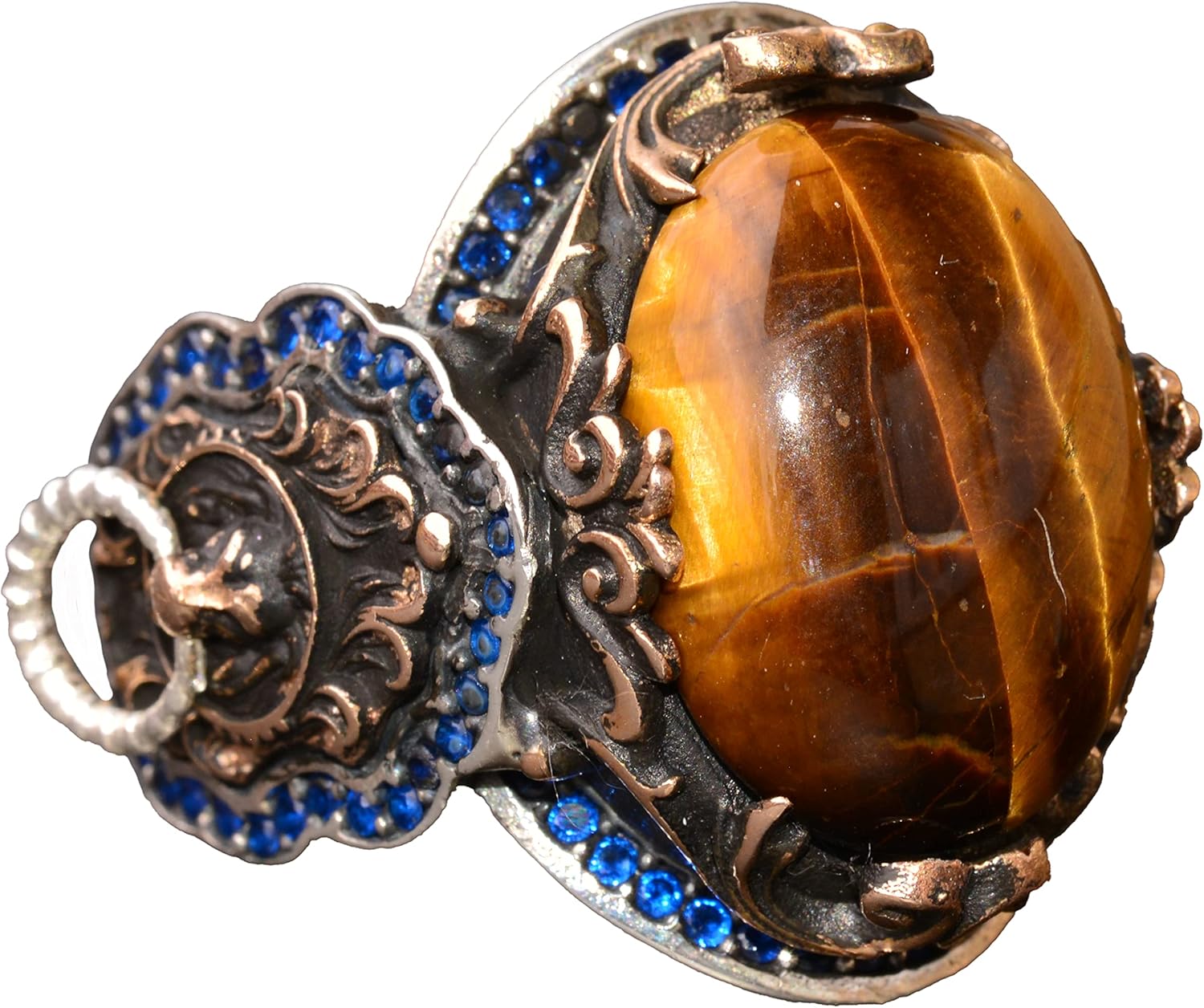El Yapımı 925 Ayar Gümüş Erkek Yüzük, Gerçek Taşlı Yüzük, Aslan Tasarımı, Altın Kaplama Doğum Taşı Yüzüğü (Kaplan Gözü)