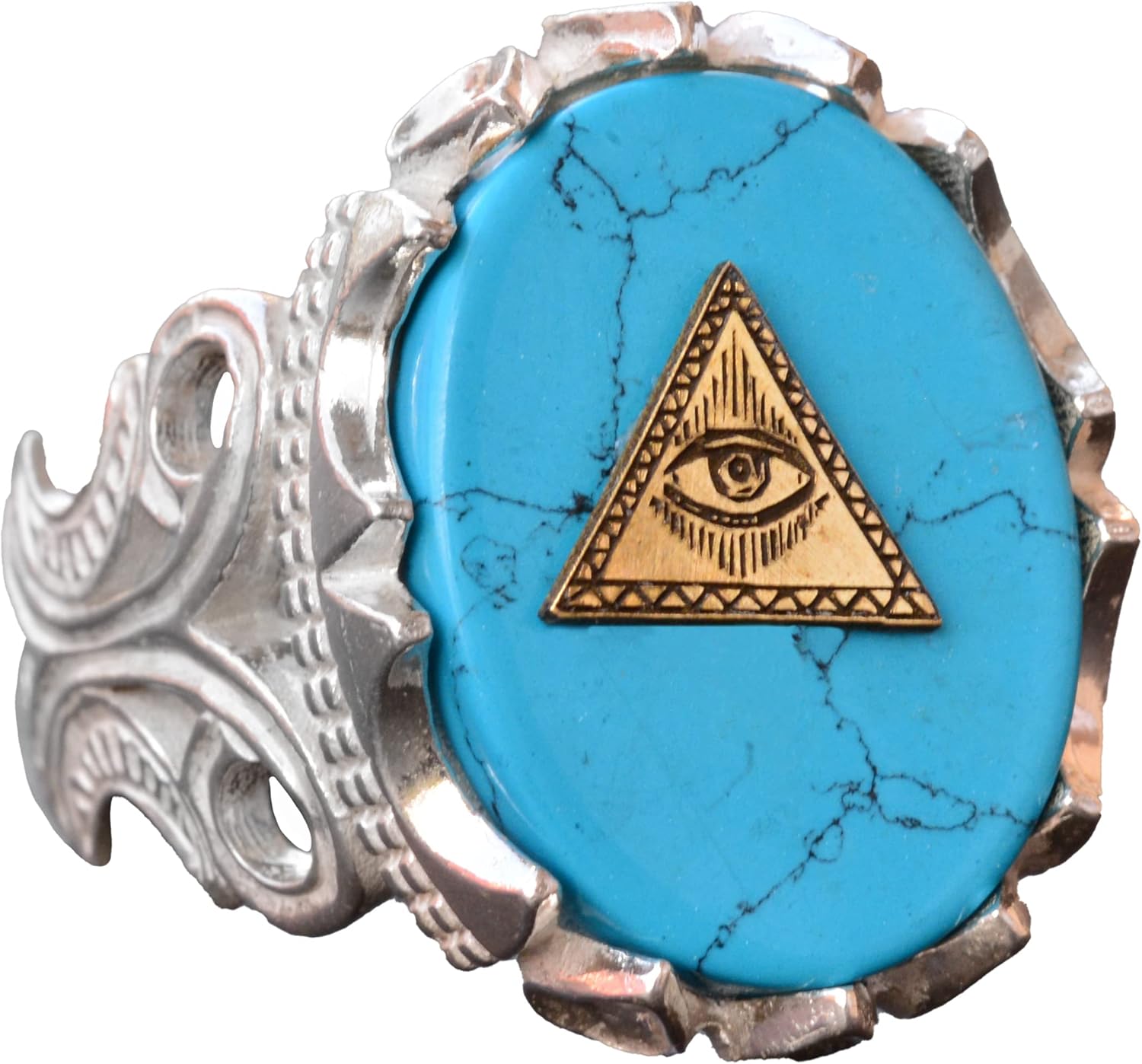 El Yapımı 925 Ayar Gümüş Erkek Yüzük, Gizemli Ezoterik Sembol, Turkuaz Taşı, Ayrıntılı Sinyet Tasarımı, Tılsım Yüzük (Kötü Göz Piramidi)