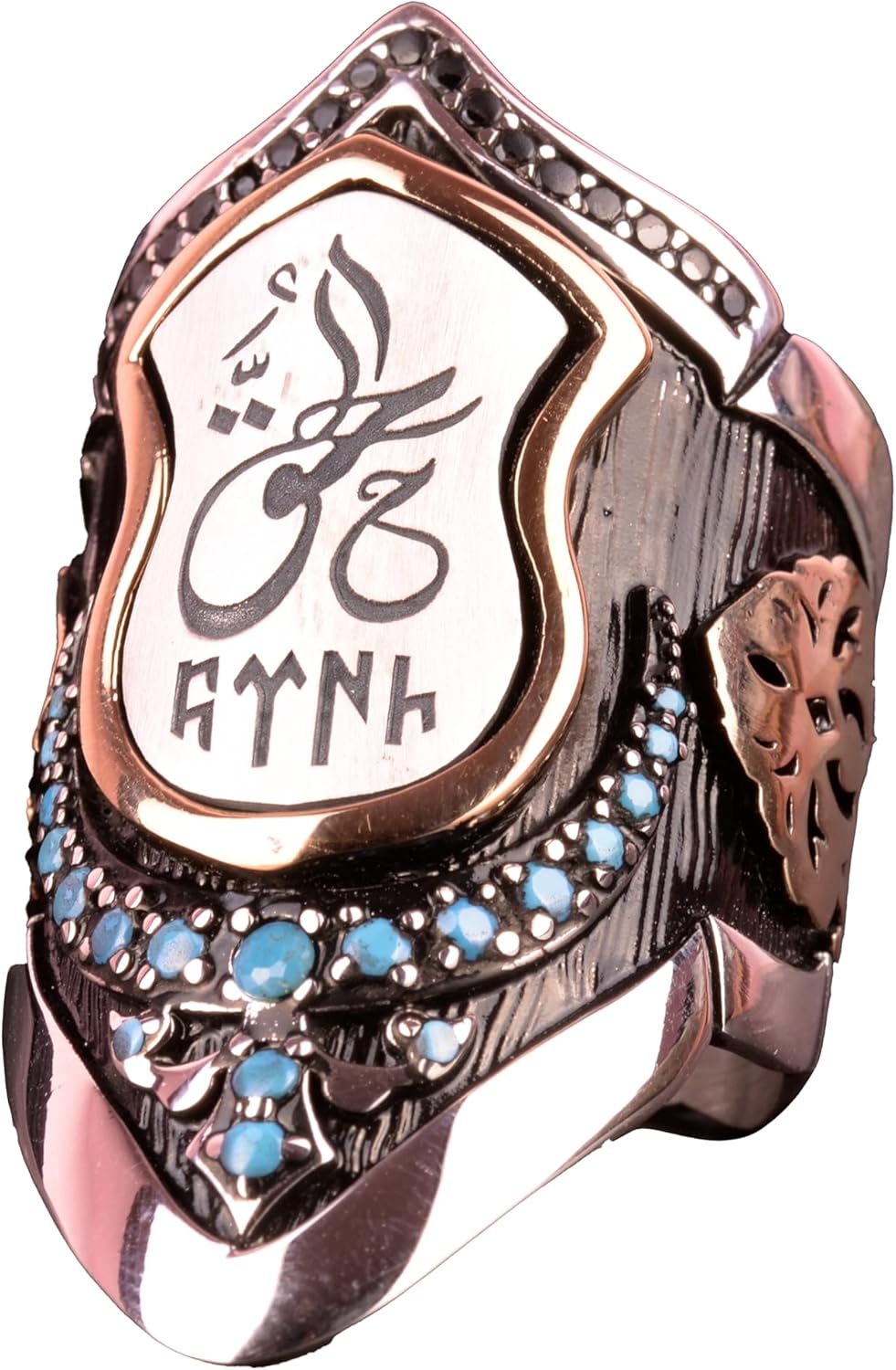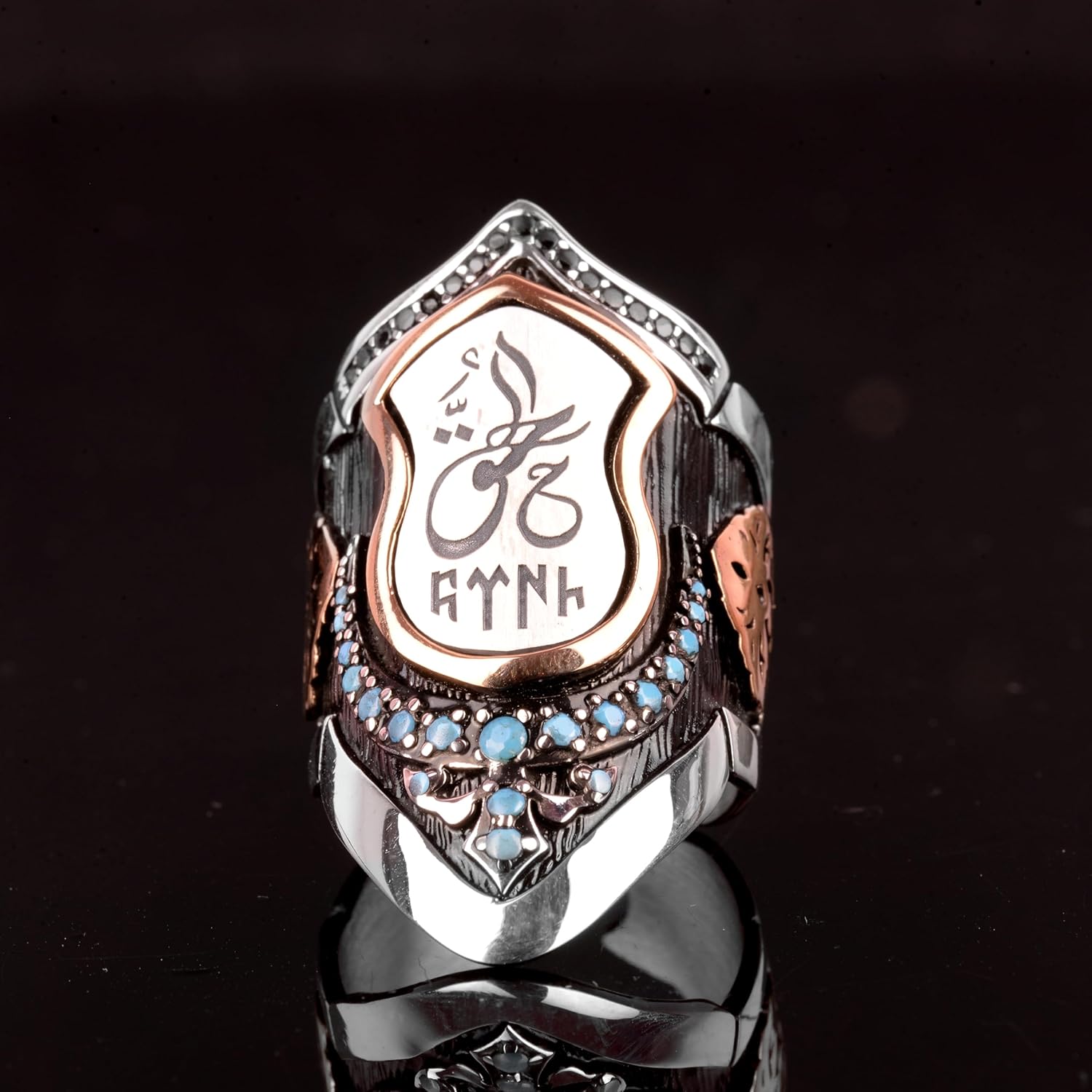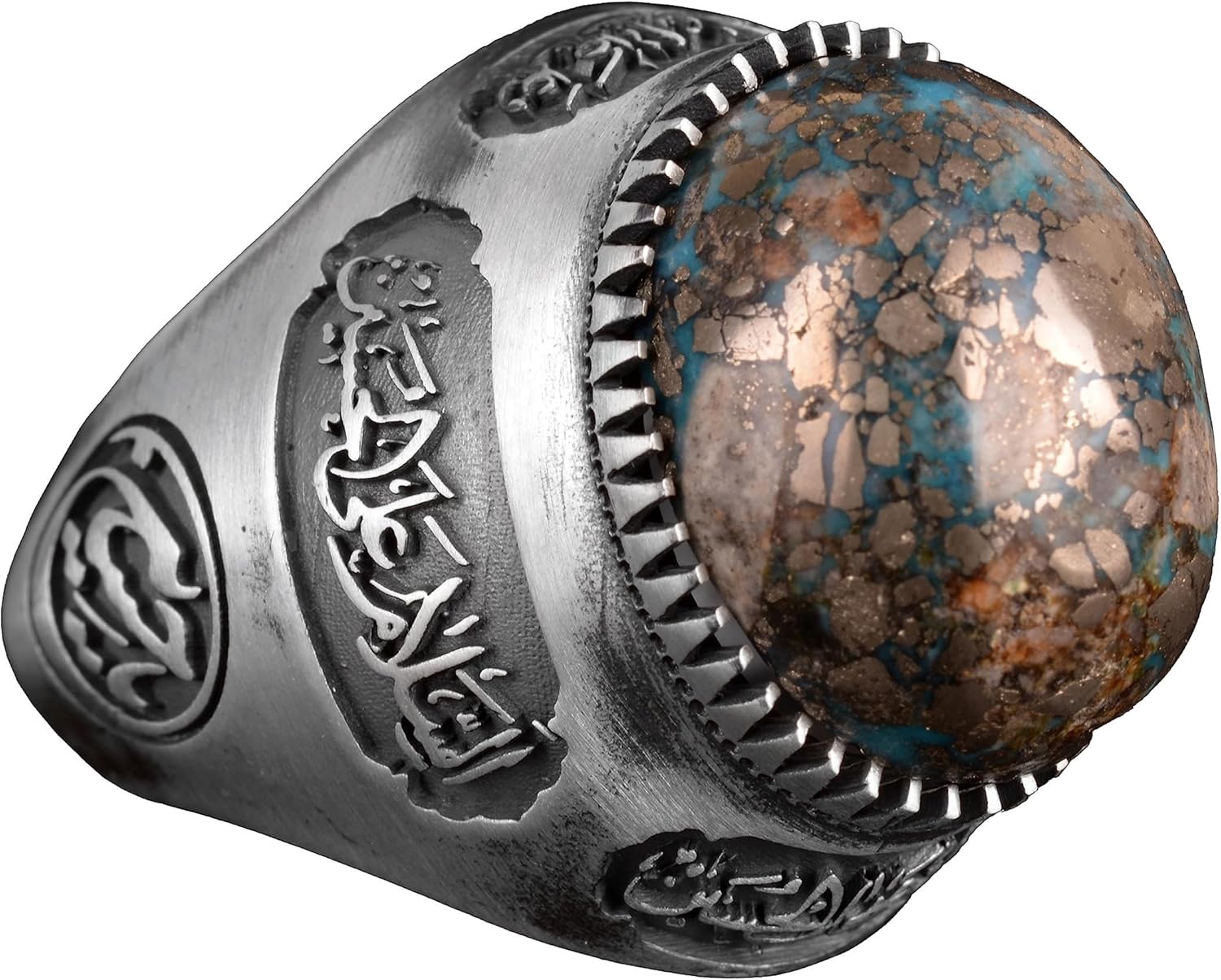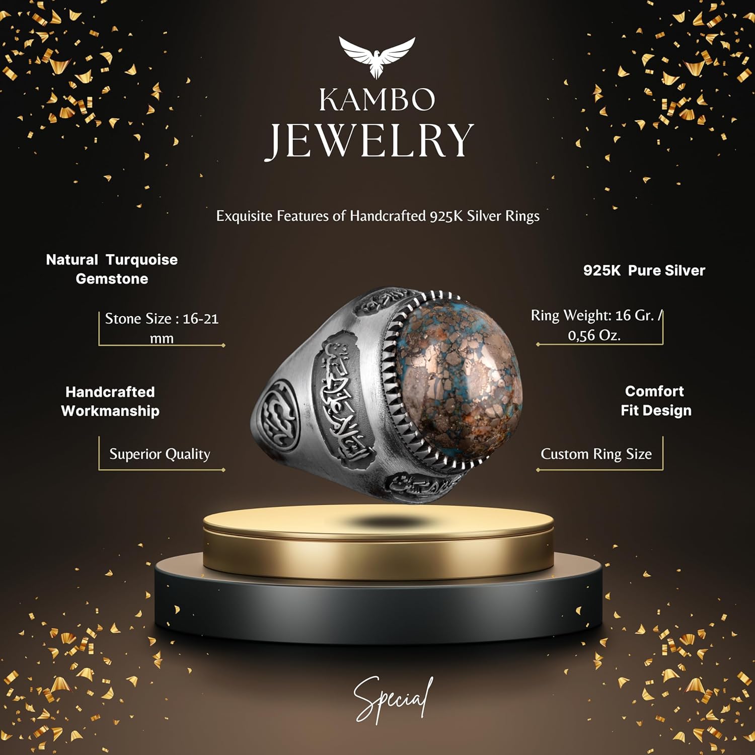 El Yapımı 925 Ayar Gümüş Yüzük, Gerçek Doğal Turkuaz Taşı ve İslami Hat ile - Erkek Takısı
